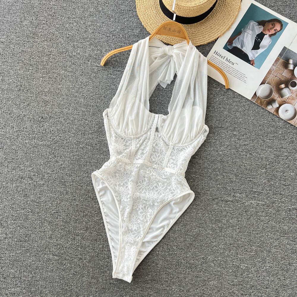 ヨーロッパとアメリカのスタイルのデザイン ニッチ メッシュ レース ホルター ネック ジャンプ スーツ女性の夏のレース ウエスト底入れ下着トレンド サマー 夏物 ヨーロピアン lyxaj14875625186