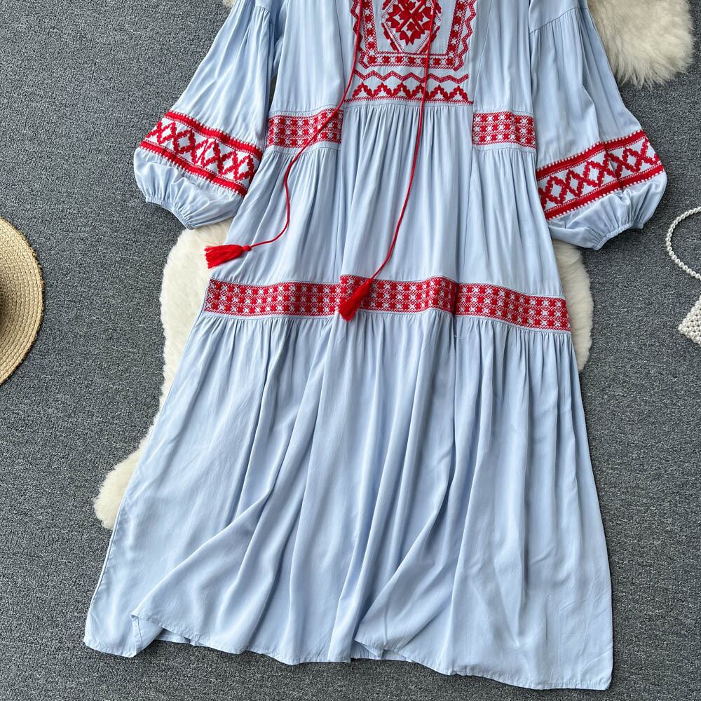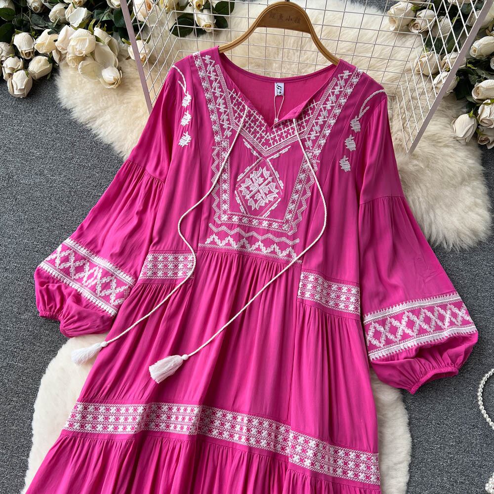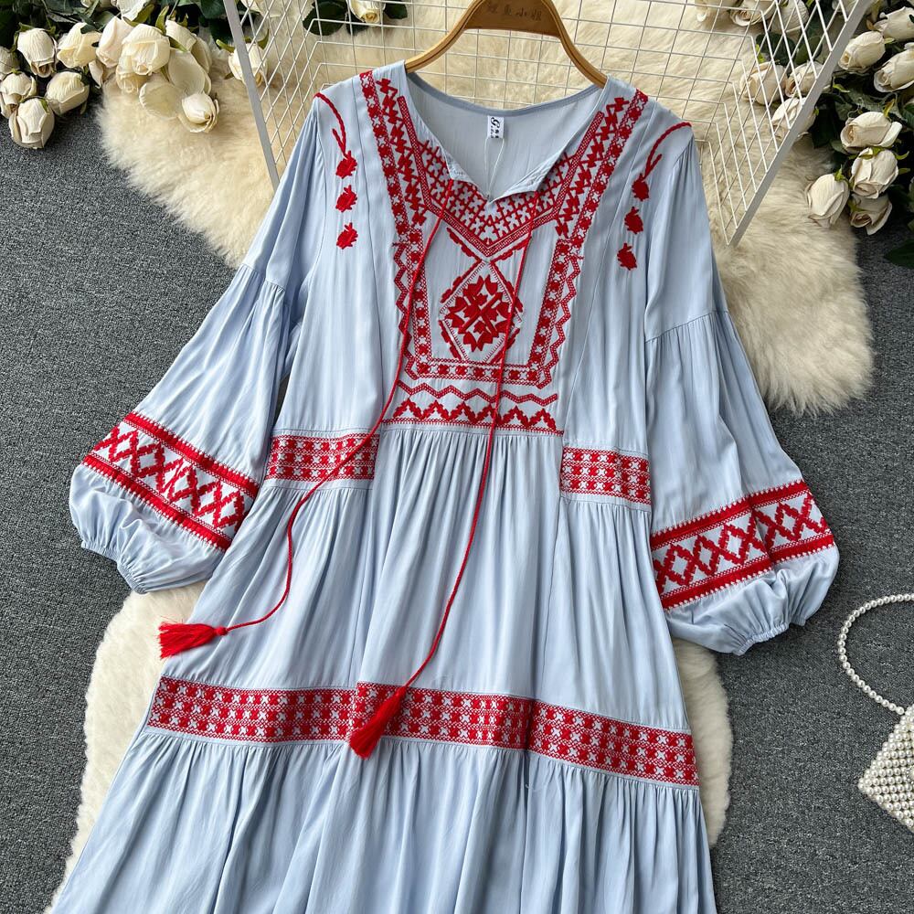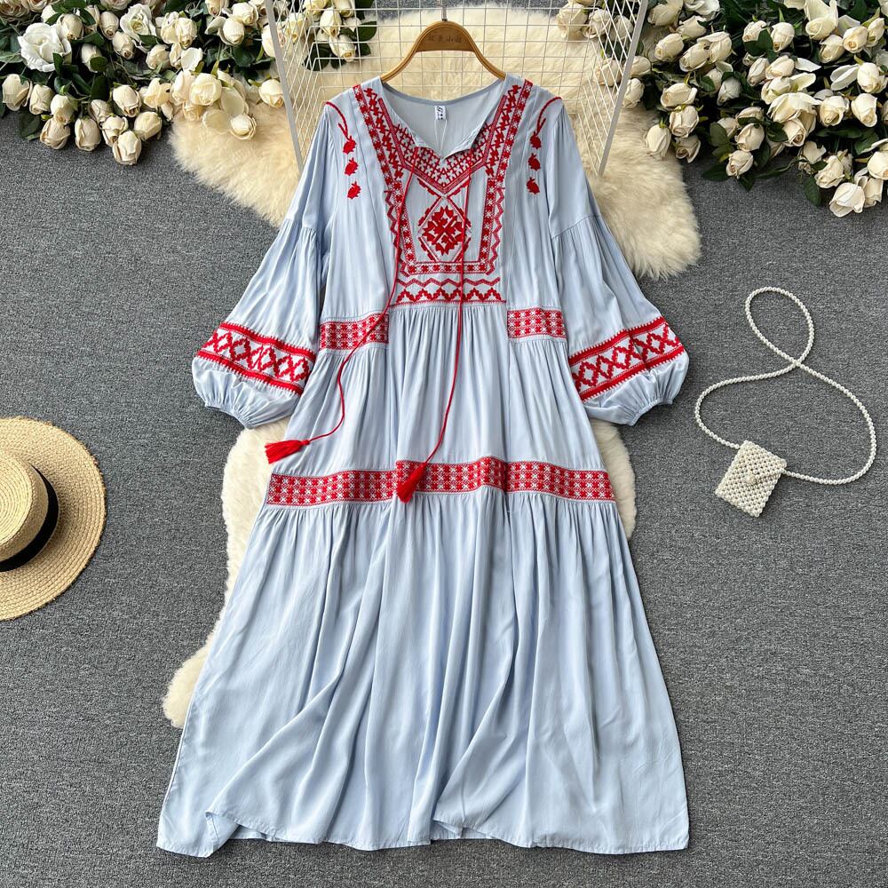 ボヘミアン エスニック ホリデー 海辺 ビーチ 気質 ドレス 旅行 写真 レトロ 刺繍 大きなスイング ロング スカート 女性 夏 サマー 夏物 lyxaj32687044954