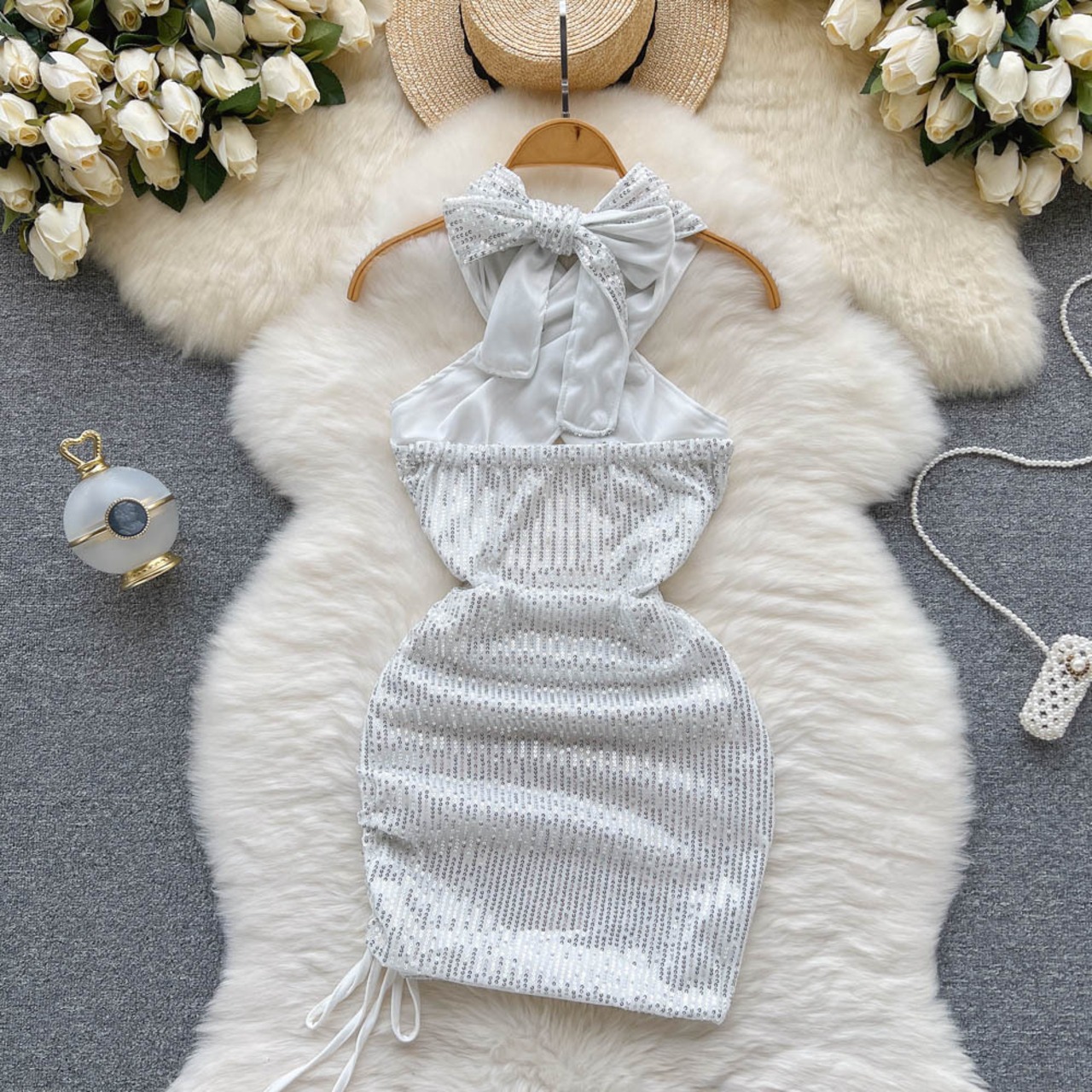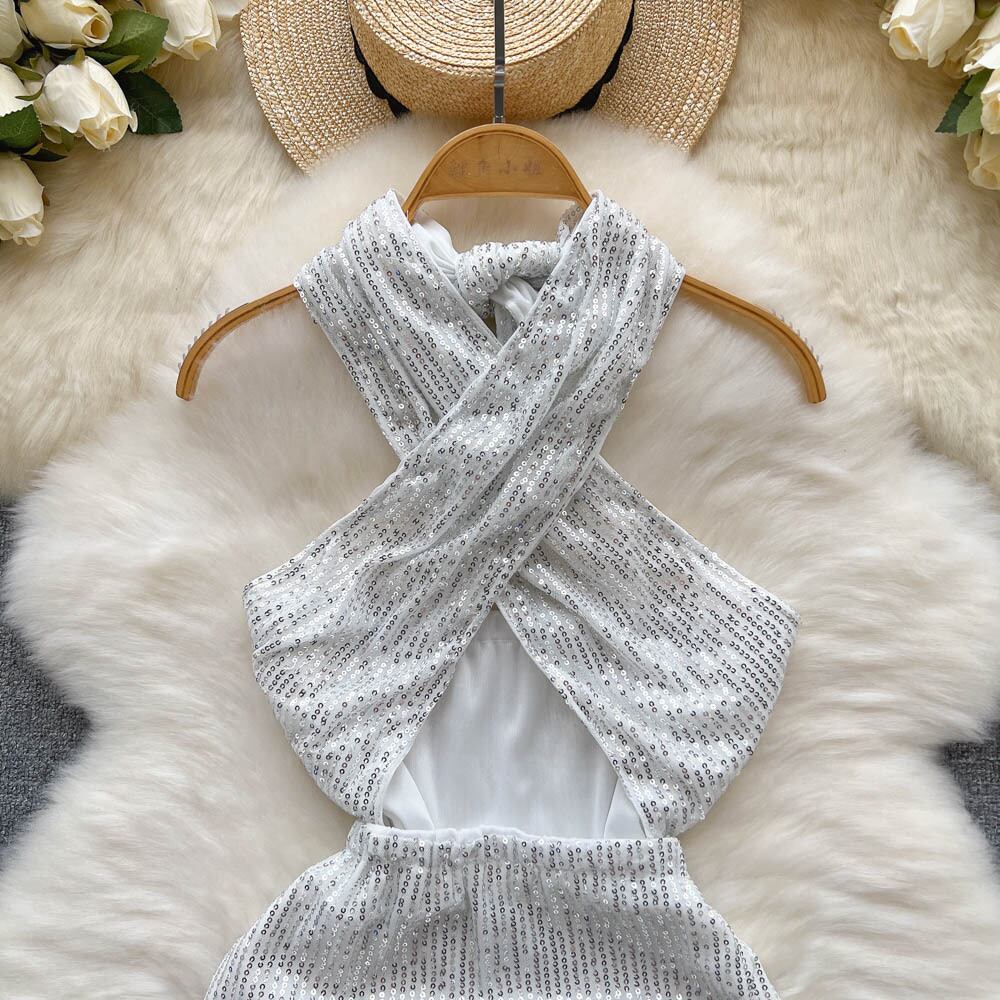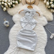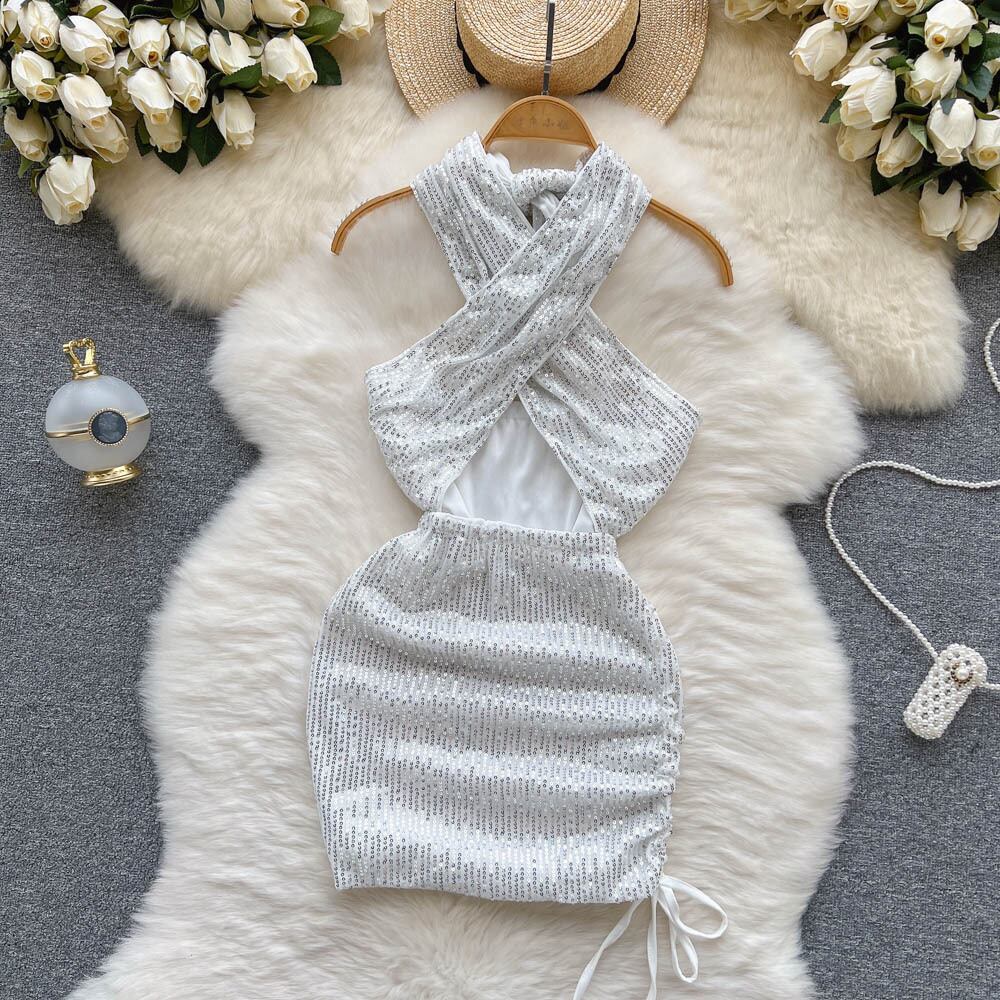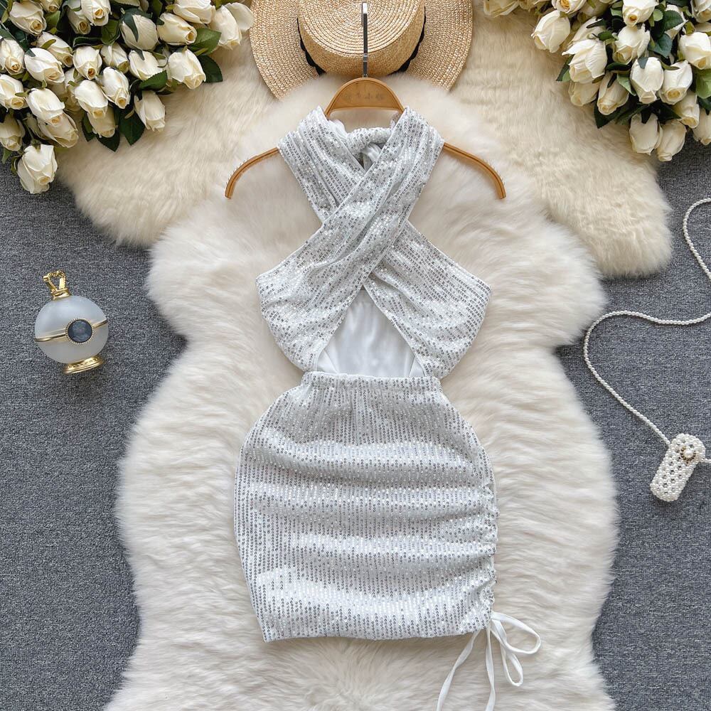 European and American style cross hollow hanging neck dress summer women's drawstring pleated slim bag hip short skirt trendy ショート プリーツ サマー 夏物 スカート スリム ヨーロピアン lyxaj19420167635