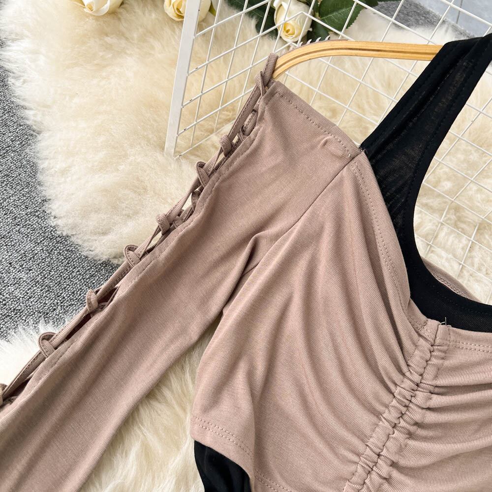 純粋な欲望ホットガールデザインコントラストカラーホルターロングスリーブドレス秋の女性のデザインレースアップヒップショートスカート 長袖 オータム 秋物 lyxaj75795770787