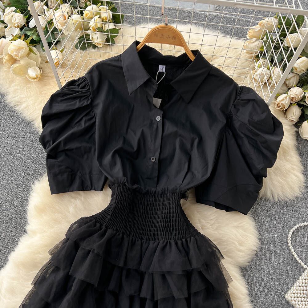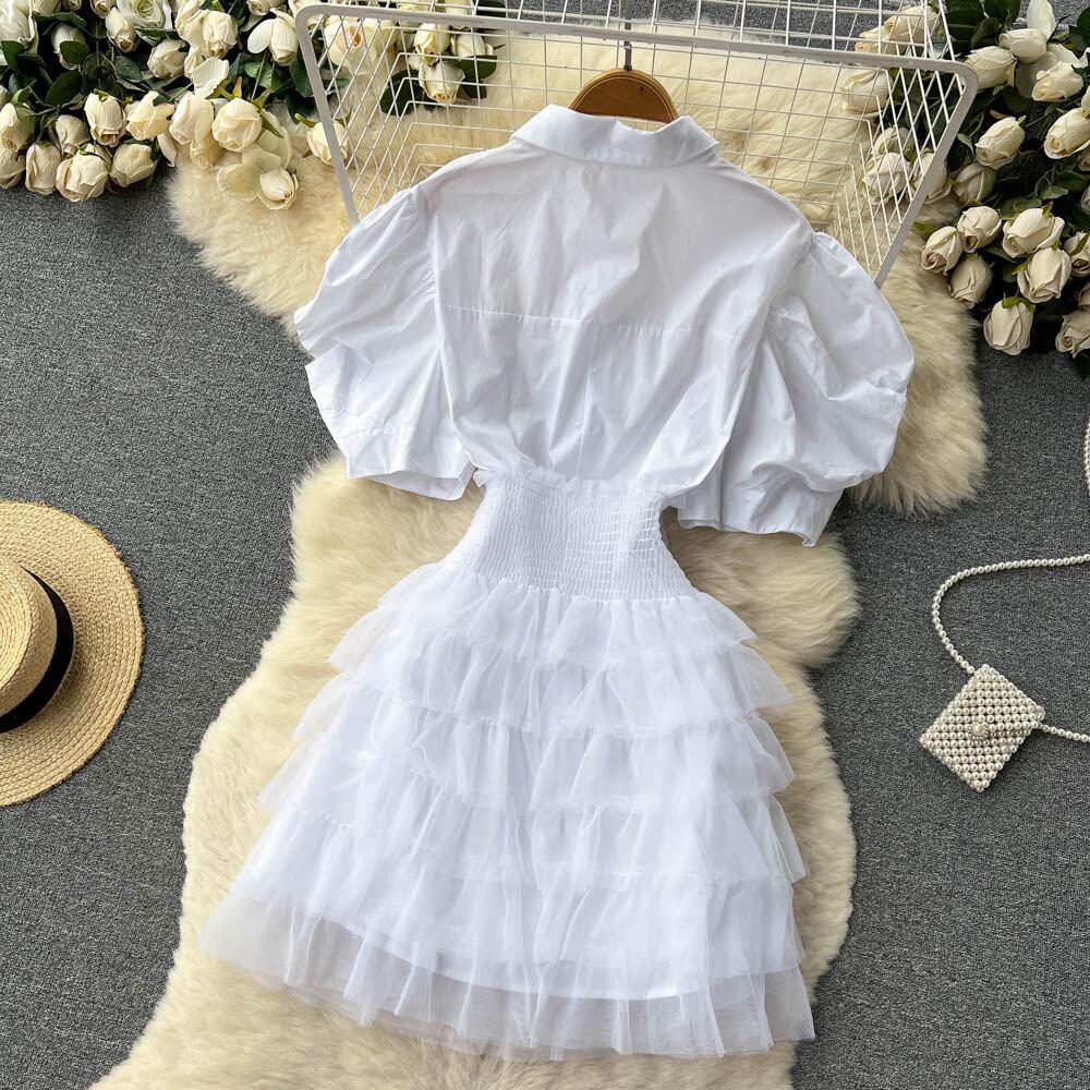 フレンチスイート初恋白スーツレディースミドル丈パフスリーブシャツハイウエストメッシュケーキショートスカート2点セット ハイウェスト ホワイト 大人ガーリー スウィート キュート カジュアル lyxaj230613625