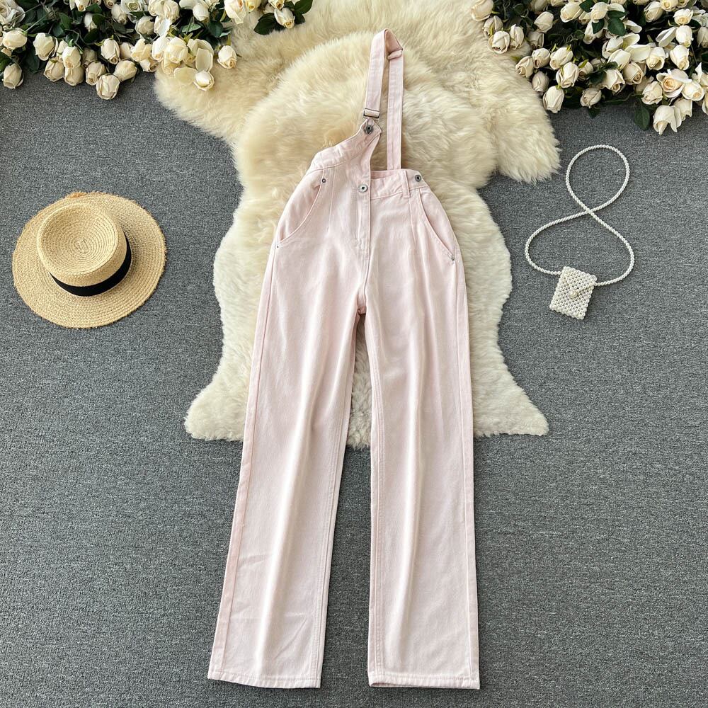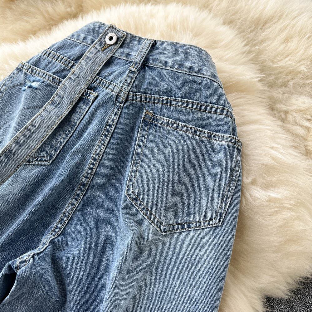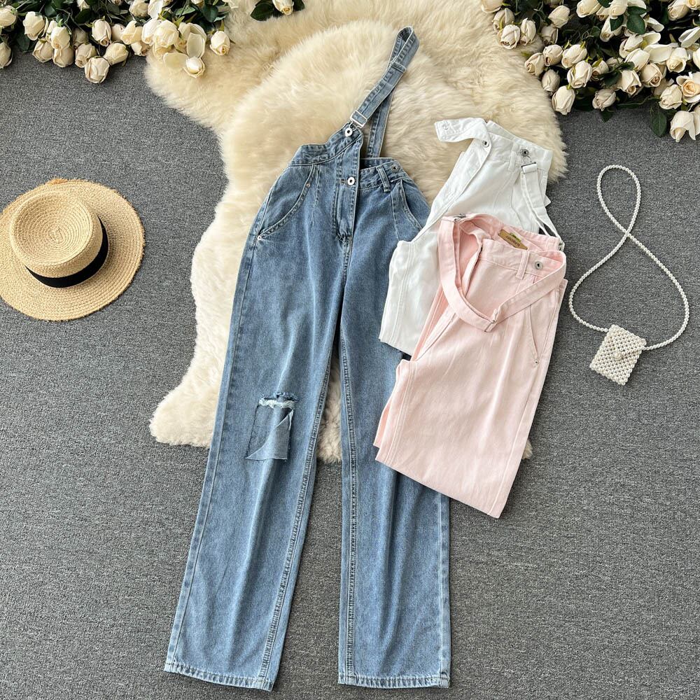 スモール ルーズ ワイドレッグ リップド ジーンズ レディース サマー シンセクション オールマッチ ワンショルダー ストラップ パンツ イン ハイストリート 潮流 夏物 lyxaj33970903147
