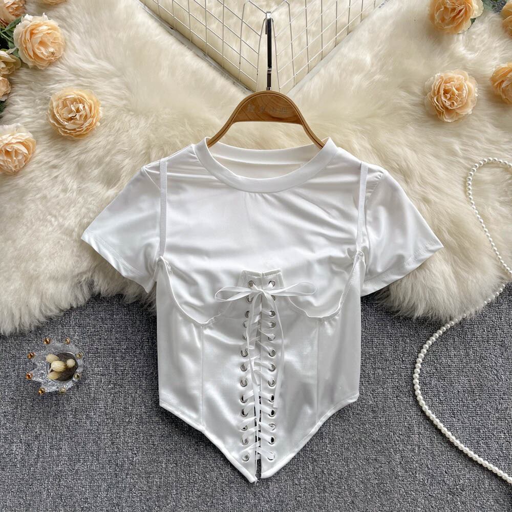 フランスのニッチなレトロな個性香港風味のトップ半袖フェイク ツーピース Tシャツ裾巾着ストラップ不規則な小さなシャツ レッド lyxaj54543948788
