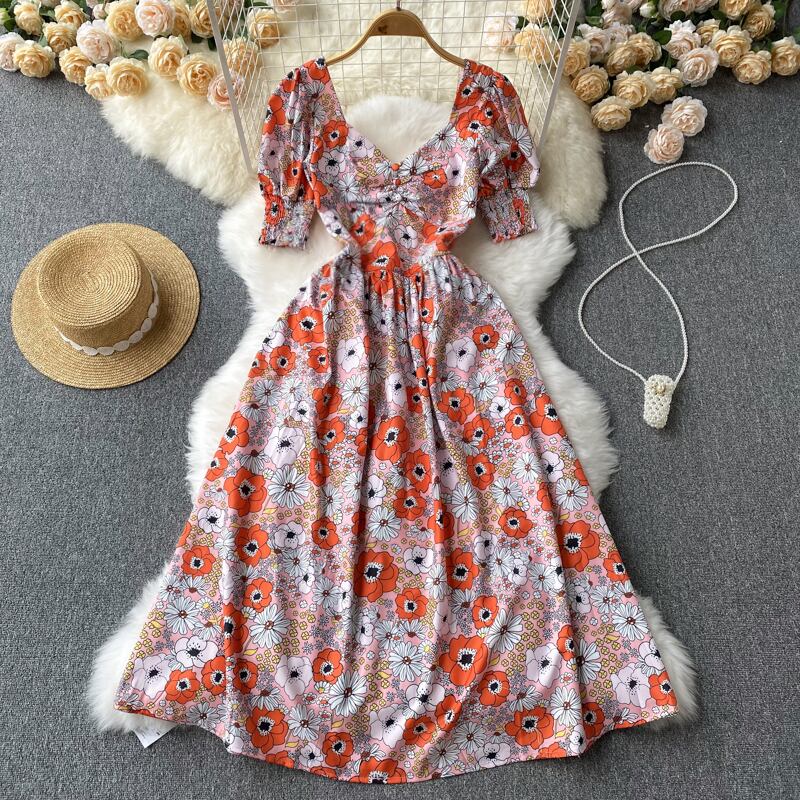 Niche design waist slim puff sleeve floral skirt 2022 summer women's new popular this year's popular dress サマー 夏物 花柄 スカート スリム lyxaj77107902074