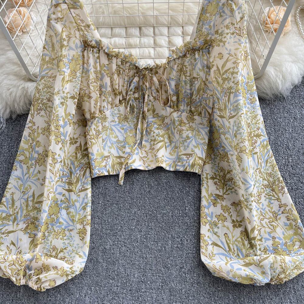 フレンチスタイルのシックで美しい小さなシャツランタンスリーブ花柄シャツトップ初秋の女性のレースアップショートスクエアカラーシャツ オータム 秋物 スクウェア lyxaj2751733315