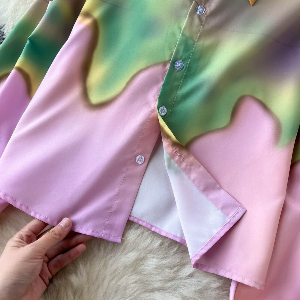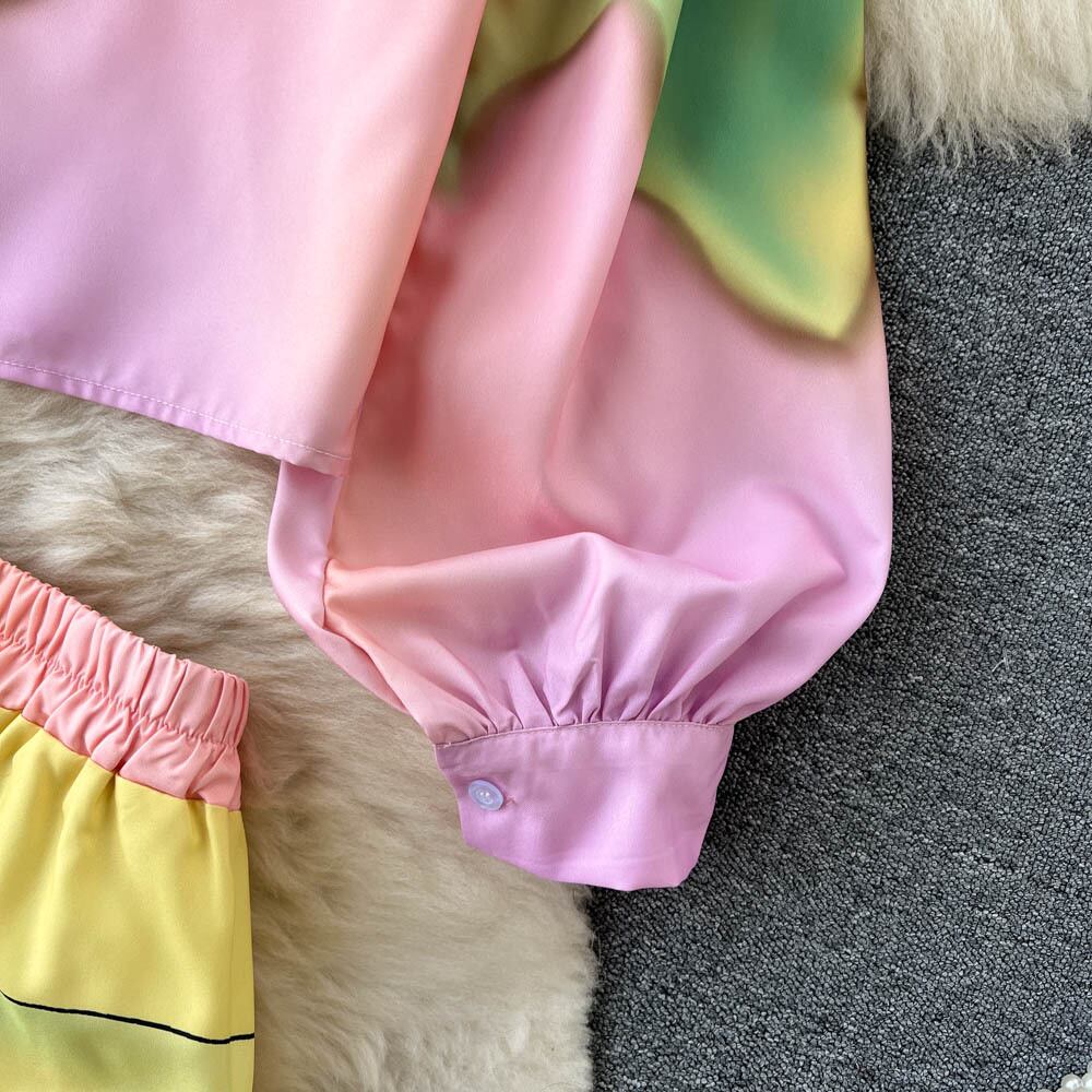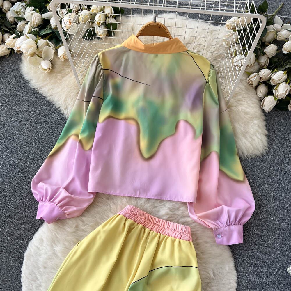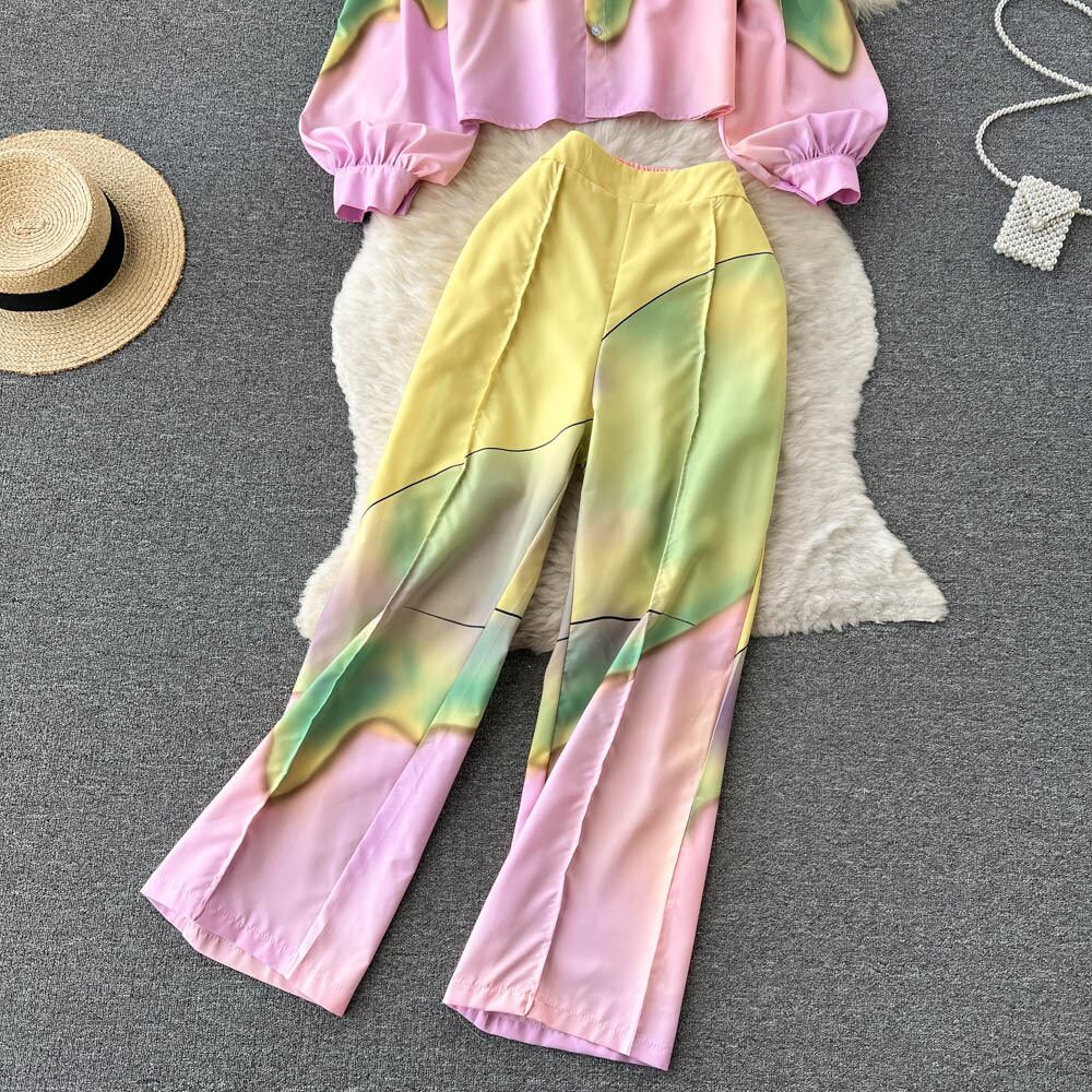 年齢を減らす美しいウエスタンスタイルのツーピーススーツ女性の夏のスタイルのプリント気質の長袖シャツトップハイウエストワイドレッグロングパンツ ハイウェスト サマー 夏物 ワイドパンツ lyxaj93291824943