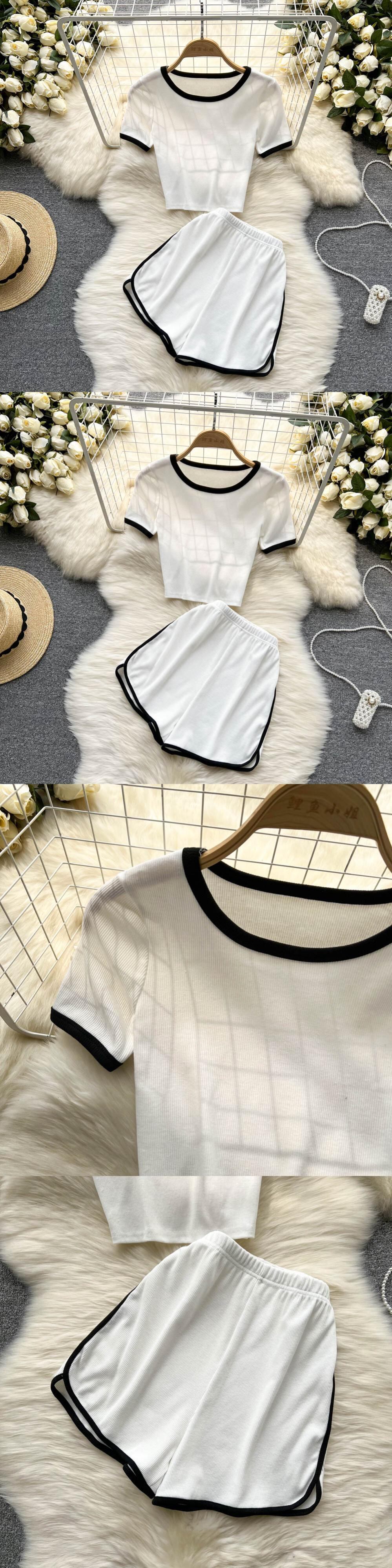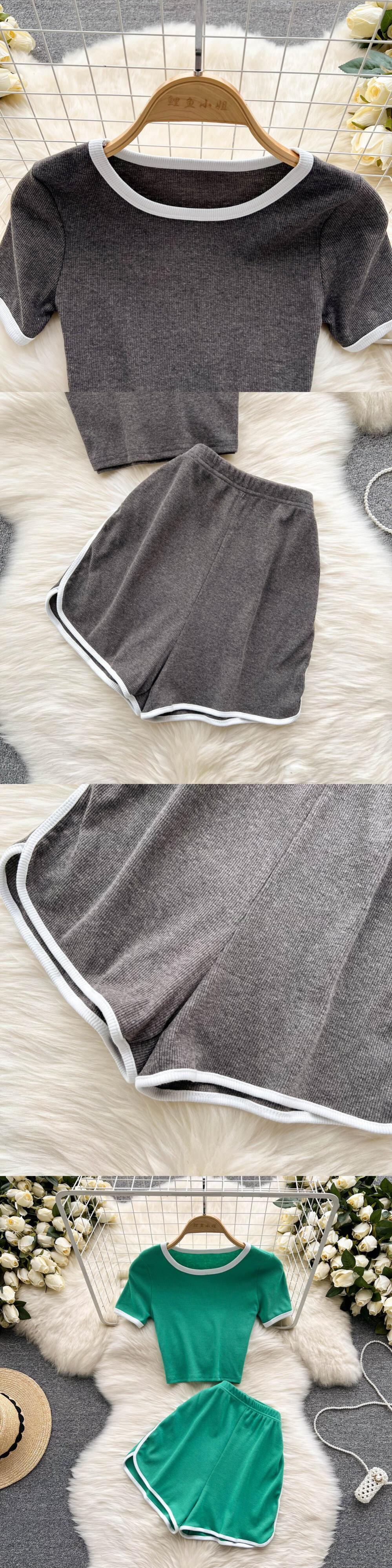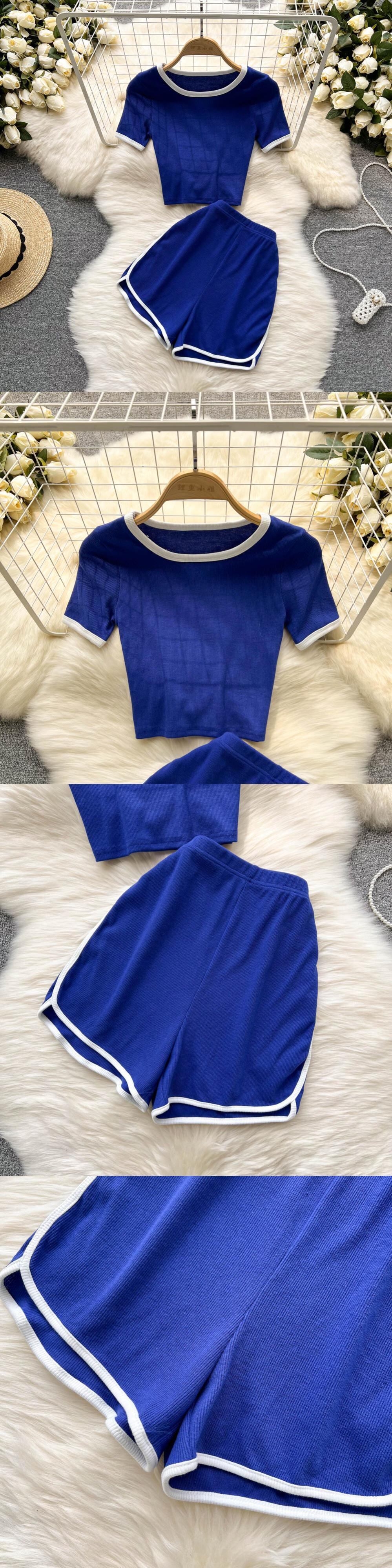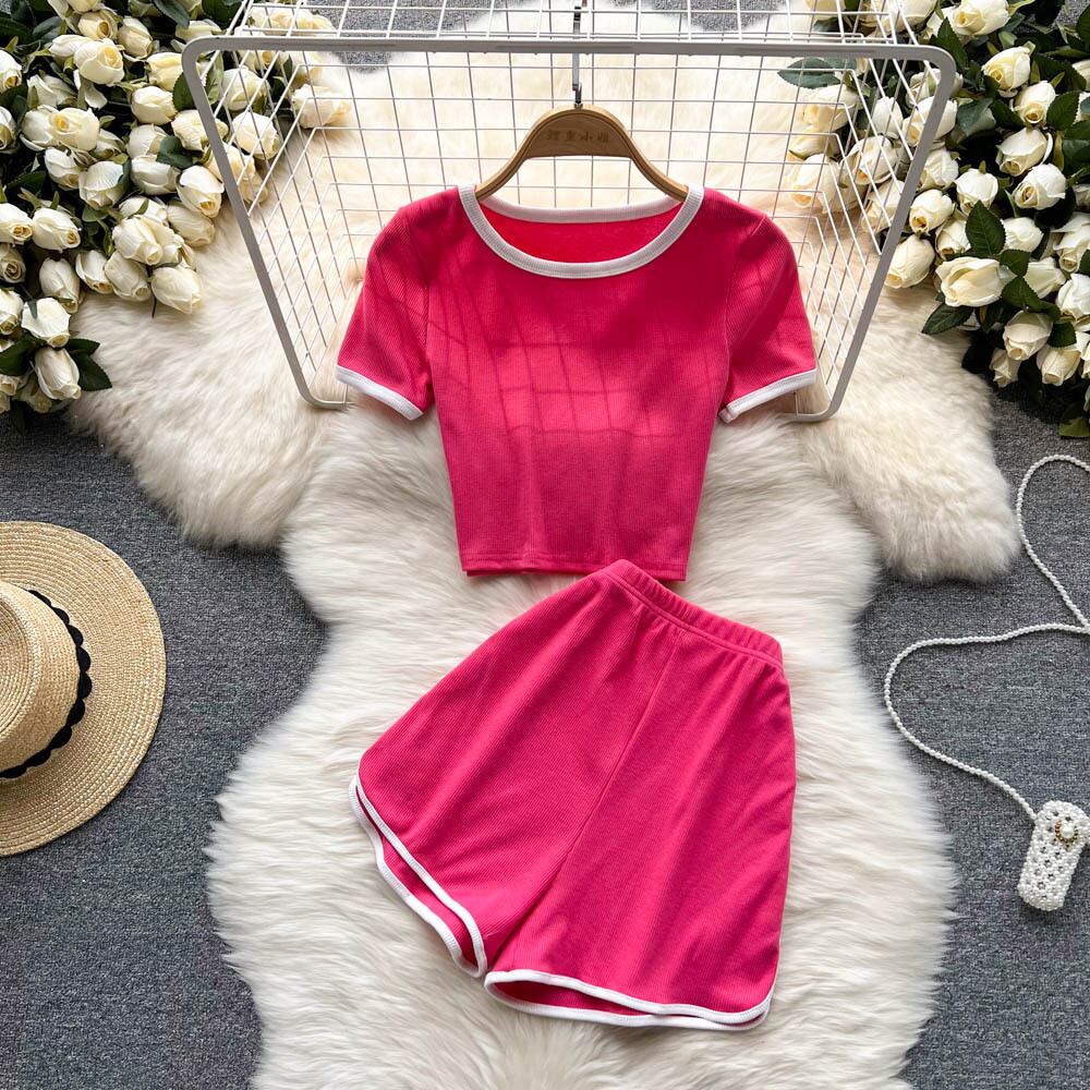 カジュアルスポーツスーツレディース夏新作ラウンドネックスリム半袖Tシャツ+ハイウエストワイドレッグショーツ2点セット サマー 夏物 ブルマー Oネック lyxaj55871293290