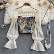 フランスのレトロなプリントの長袖シャツの女性のデザインセンスのニッチは、甘くて塩辛い妖精の気質の短いスリムなトップにすることができます ショート ロング 大人ガーリー スウィート キュート カジュアル lyxaj67219397784