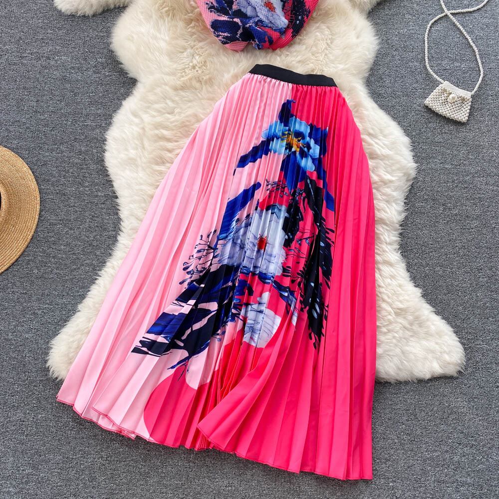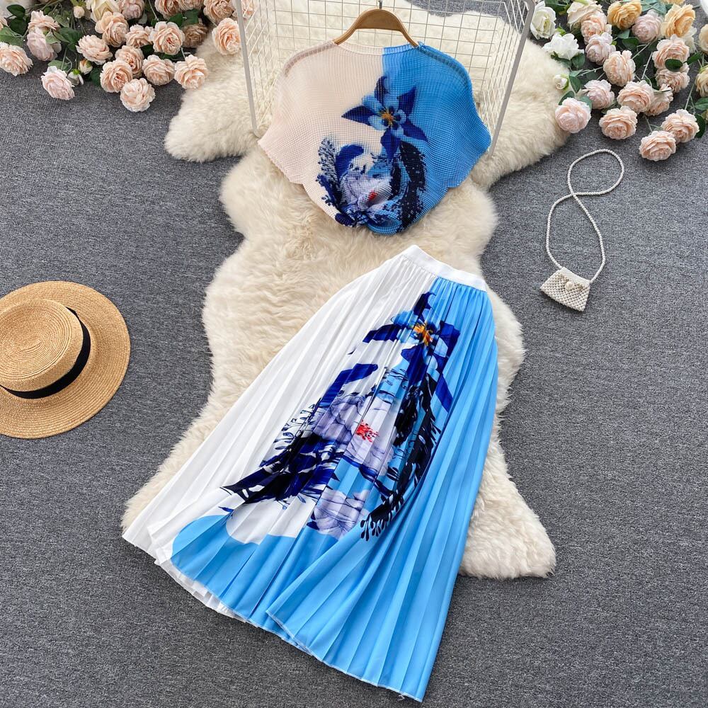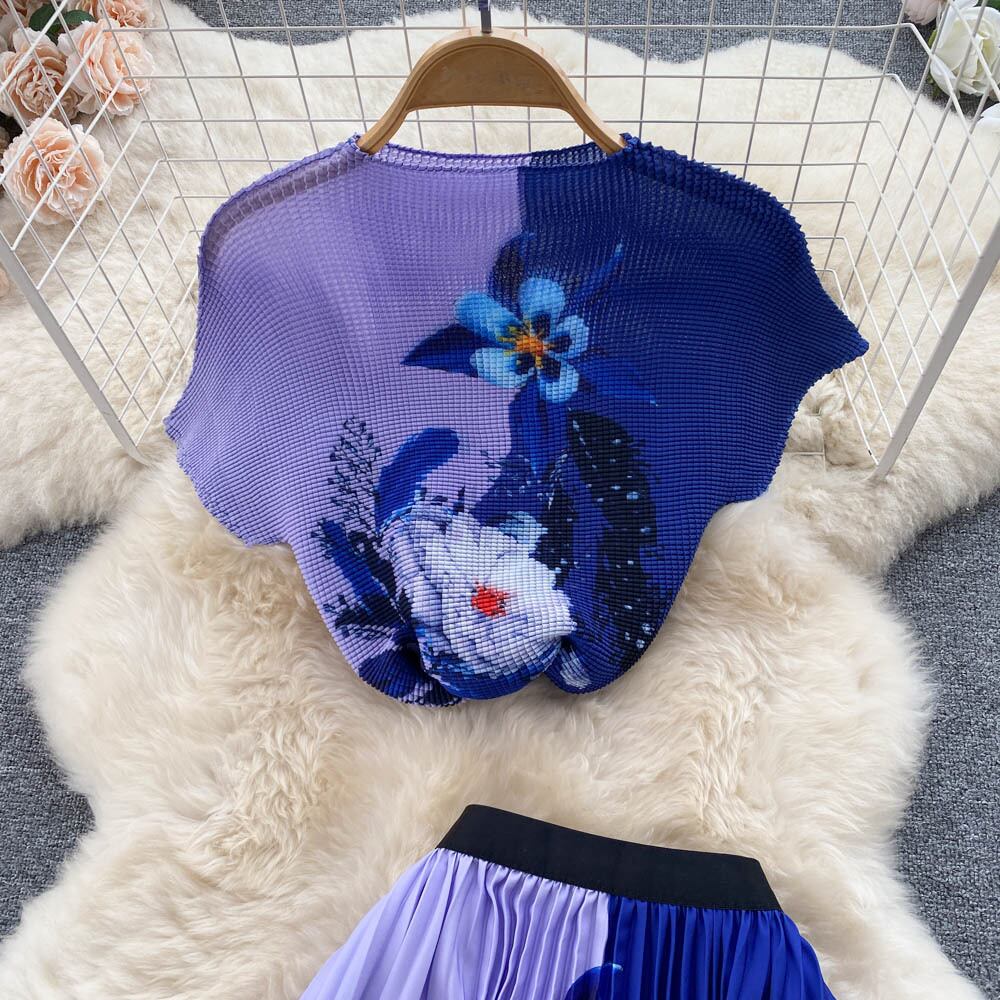 Ethnic style two-piece suit female summer temperament celebrity print short T-shirt top high waist pleated skirt ハイウェスト ショート プリーツ サマー 夏物 スカート Tシャツ lyxaj37652341140