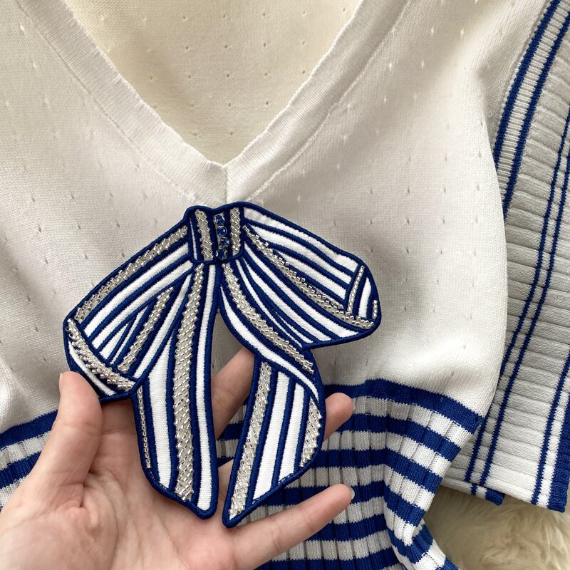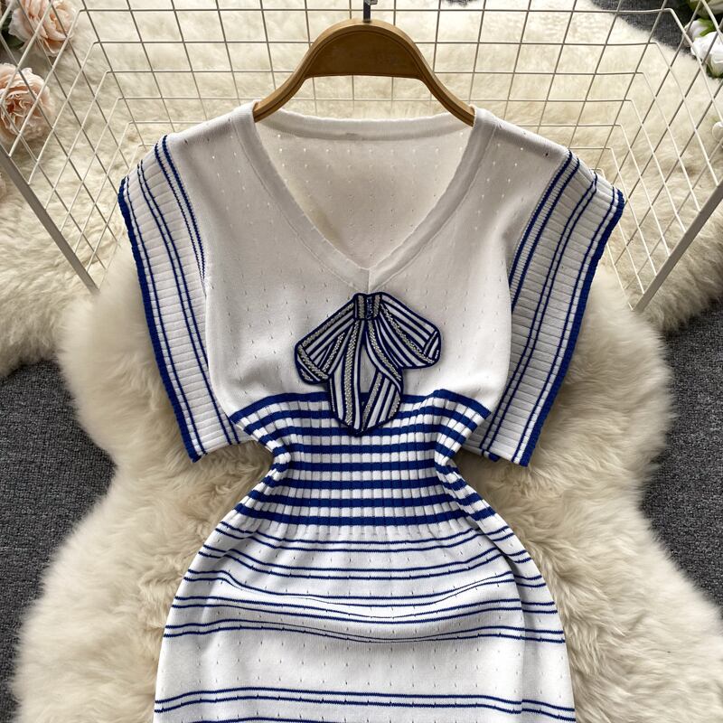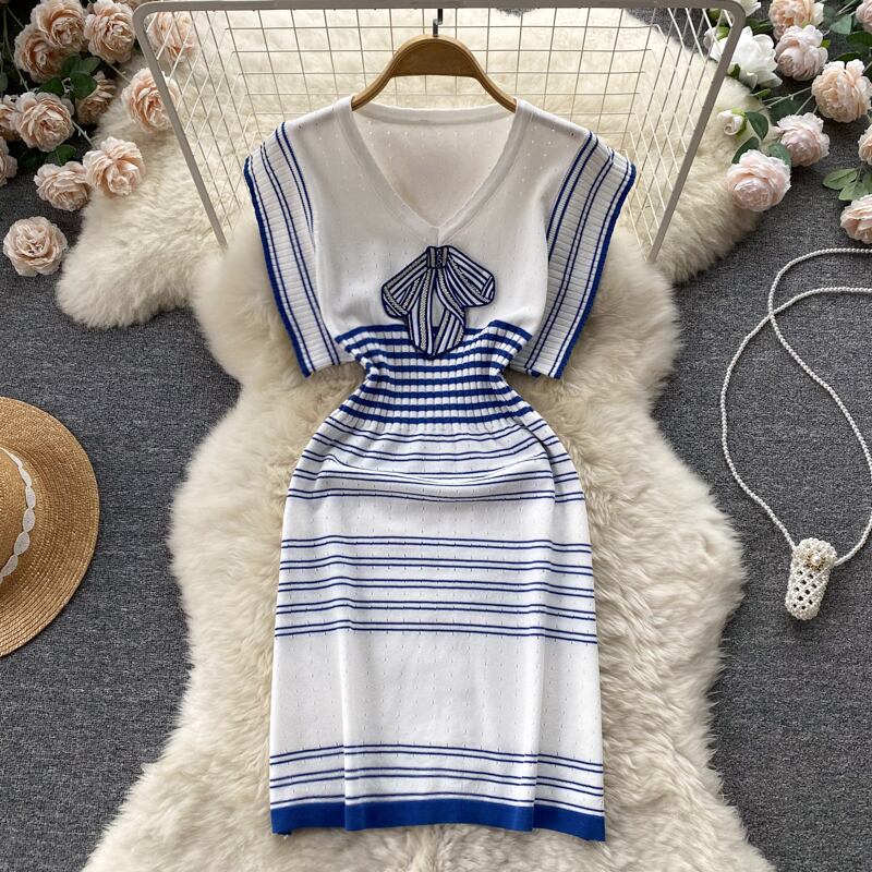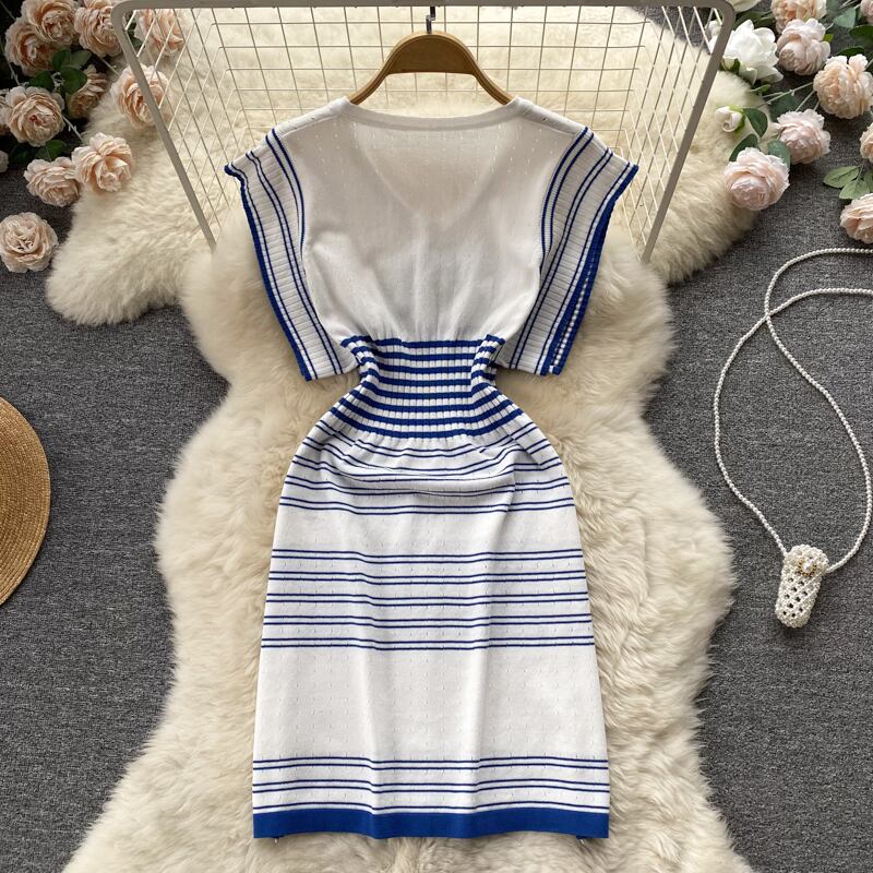 French waist slim striped knitted dress summer women's artistic sense V-neck slim bag hip short skirt trendy ショート サマー 夏物 スカート Vネック ストライプ スリム lyxaj99848651079