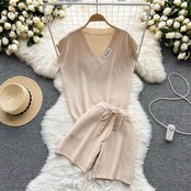 スウィート V ネック ルーズ レター パッチ ノースリーブ ニット セーター + ドローストリング ハイウエスト カジュアル ワイドレッグ ショーツ レディース ツーピース スーツ 大人ガーリー キュート ブルマー Vネック ワイドパンツ lyxaj41214467787