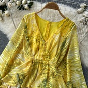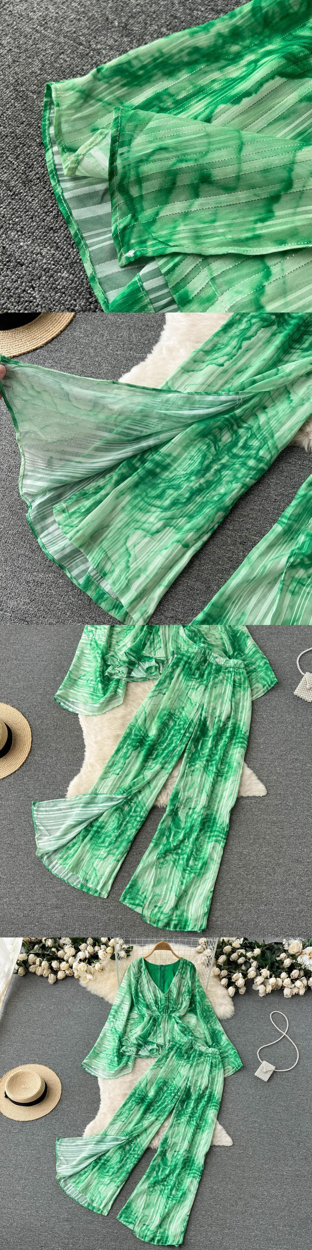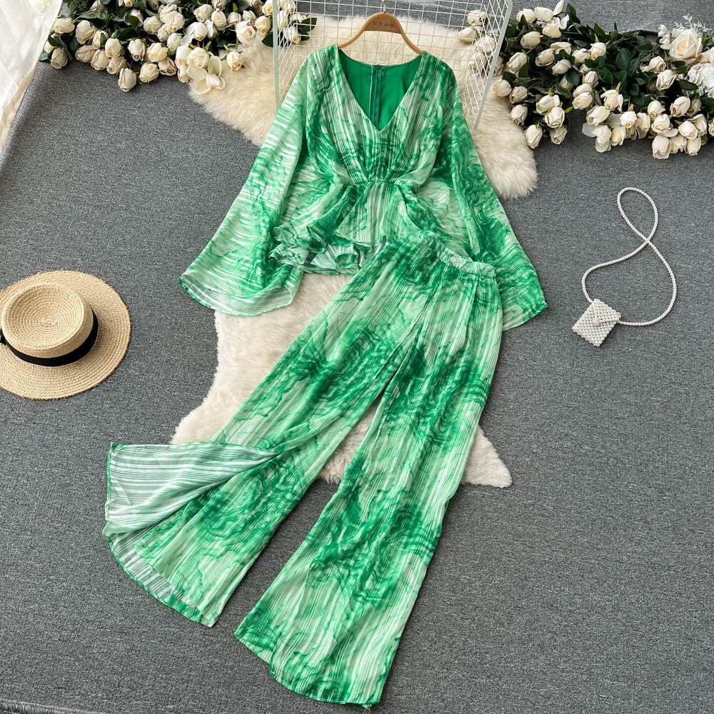 Retro tie-dye super fairy temperament suit female irregular thin V-neck long-sleeved top high-waisted wide-leg pants two-piece set ロング レトロ Vネック lyxaj4292111608