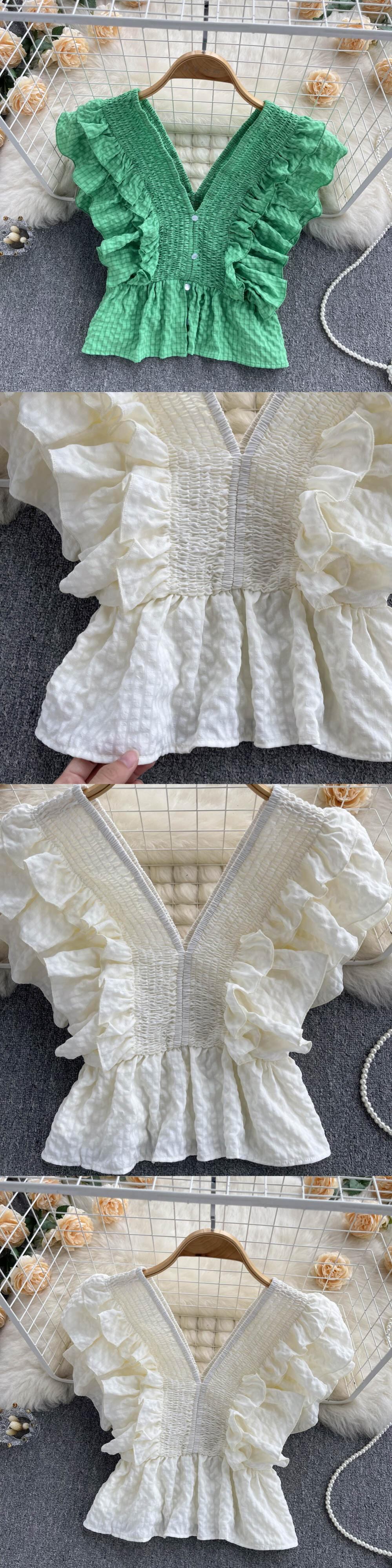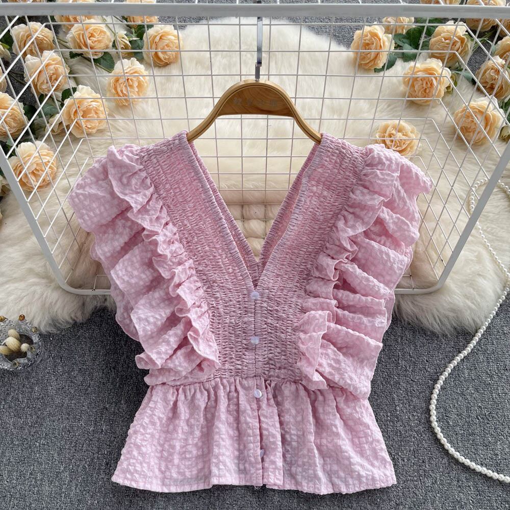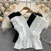 夏のニッチ感のある女性のためのベリーフェアリートップホワイトVネックシャツフリルスリムフィットウエスタンスタイルシャツ サマー 夏物 lyxaj62730682796