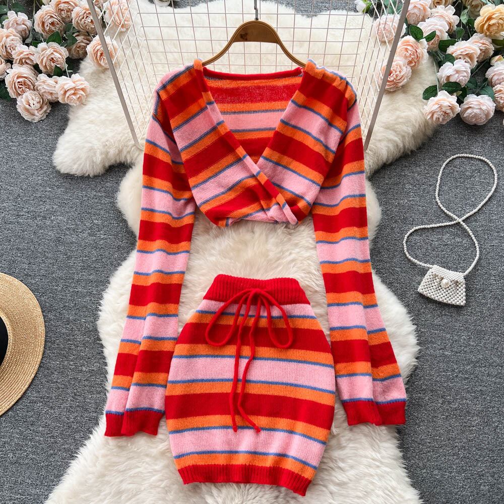 ネットセレブ 加齢臭スーツ レディース 秋 コントラストカラー ストライプ 長袖 ニットセーター 上着 ヒップ ハーフ丈 ショートスカート 2点セット ロング オータム 秋物 lyxaj47877848437