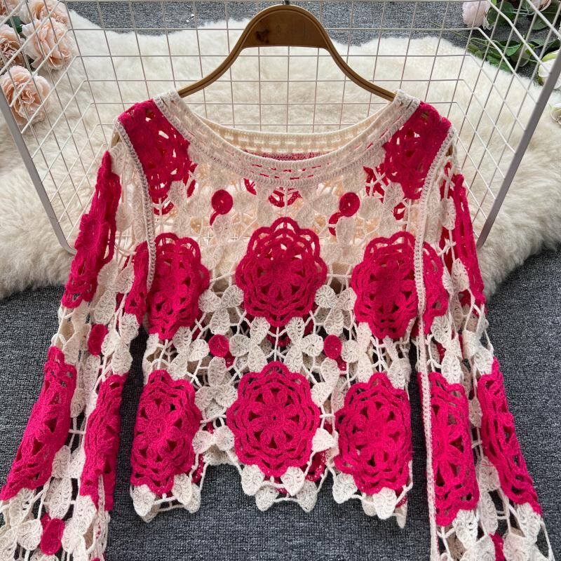 sense retro crochet hollow long-sleeved sweater sunscreen long-sleeved thin autumn loose short top women's tide ショート ロング レトロ オータム 秋物 lyxaj30650744652