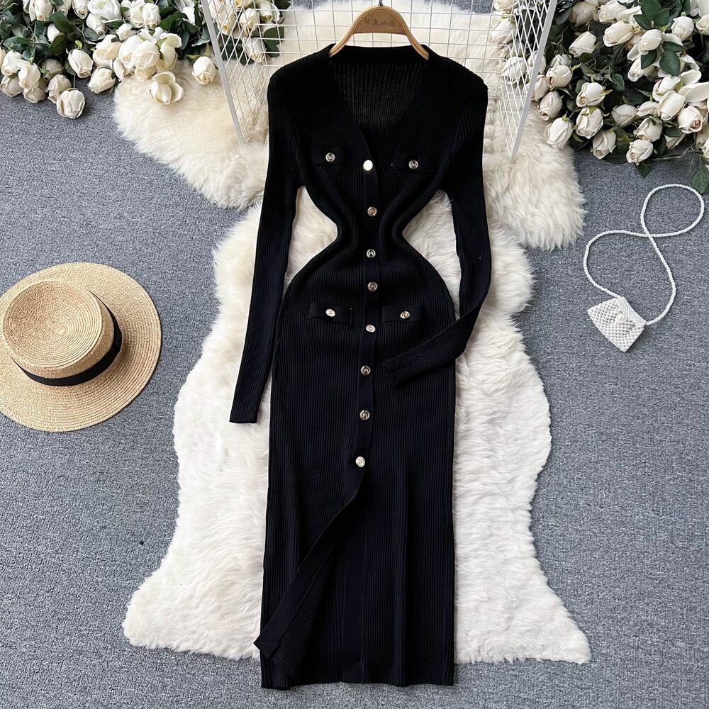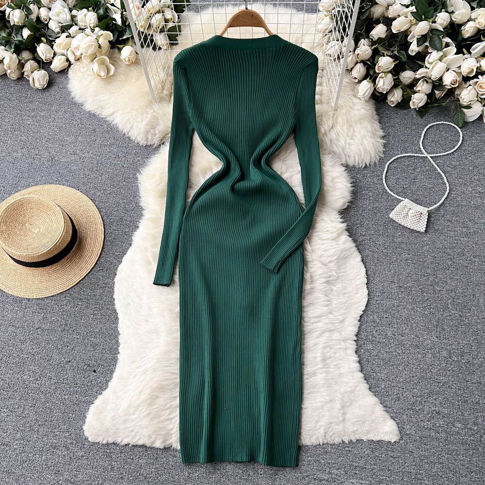Light and mature style, waist and thin temperament V-neck dress autumn women's high-end long-sleeved knitted hip-length dress ロング オータム 秋物 Vネック lyxaj20458813079