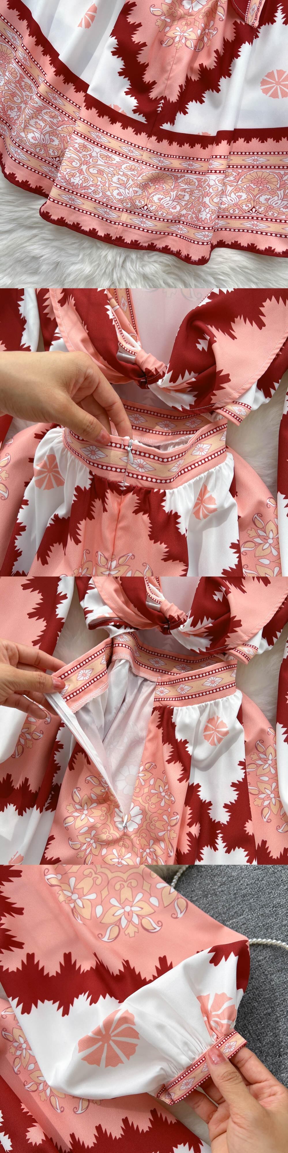 European and American ins printing V-neck ultra-low-cut lantern sleeve dress women's waist-length temperament all-match super fairy eign-style A-line skirt ランタンスリーブ スカート Vネック Aライン ヨーロピアン lyxaj19051813609