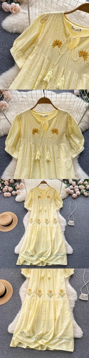 エスニックスタイルの海辺の休日のスカートフランスのレトロな刺繍中空パフスリーブドレス女性のゆったりとした大きなスイングドレス ロング lyxaj5152307764
