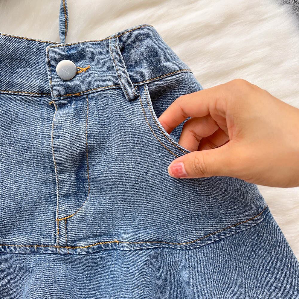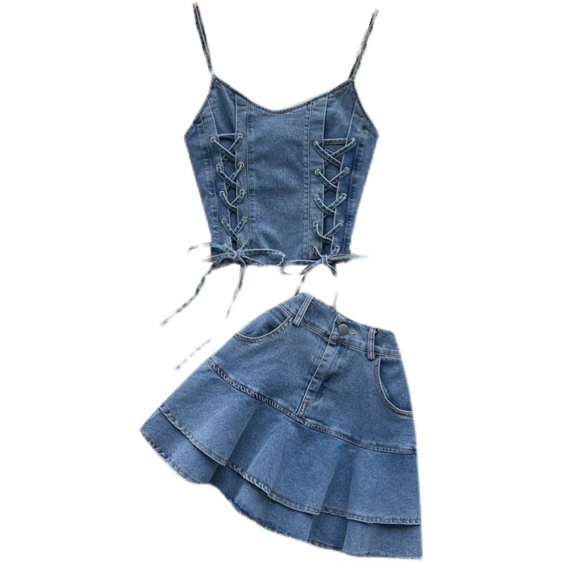 レトロデニムストラップデザインショートセクション痩身サスペンダートップホットガールハイウエストショートスカートツーピーススーツ潮 ハイウェスト lyxaj96446225914