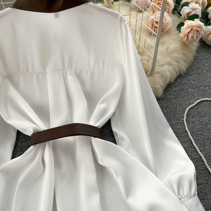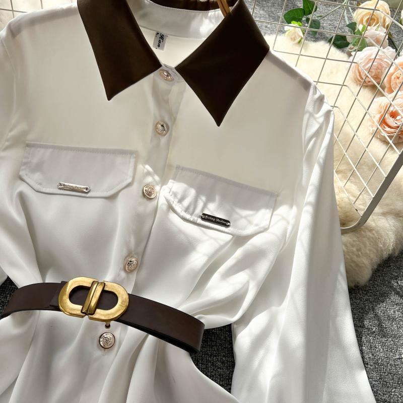 -end sense of design sense of niche color contrast temperament long-sleeved shirt top autumn women's mid-length satin shirt tide ロング オータム 秋物 サテン lyxaj32835227962