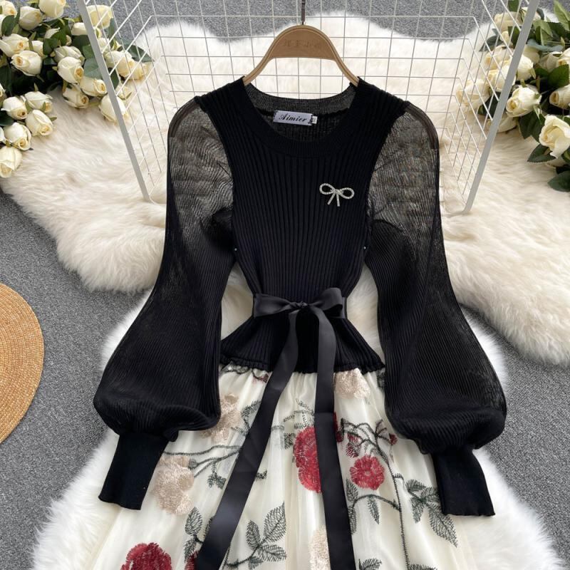 有名人の女神ファン服気質ハイエンド重工業刺繍パフスリーブメッシュ糸ステッチニットフェイクツーピースドレス lyxaj97912311793