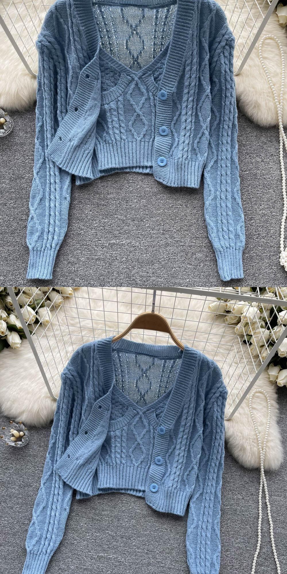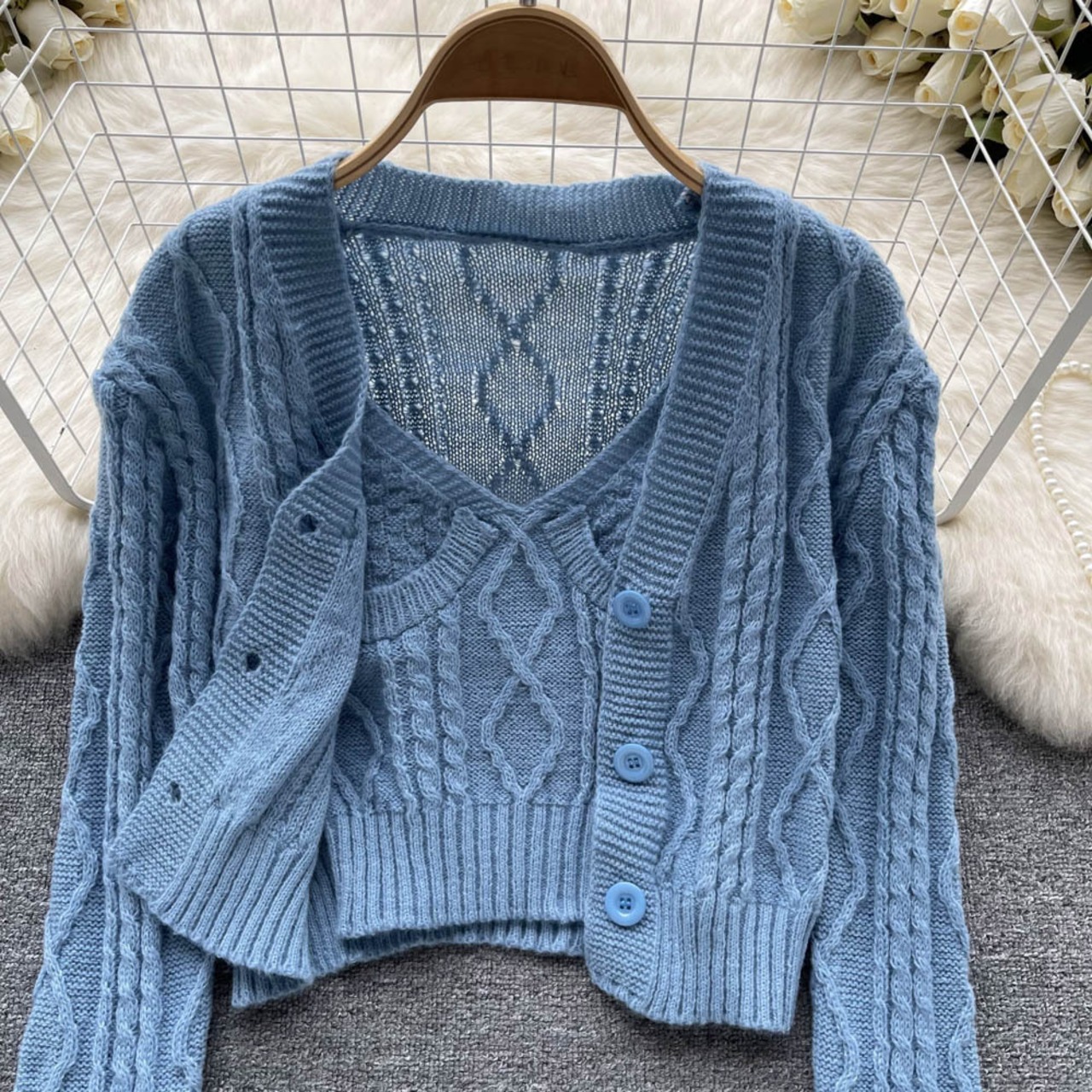 ツーピーススーツ レディース 秋ファッション 洋風 おしゃれ ツイスト 長袖 セーター カーディガン コート ショート 小さめ キャミソール ロング オータム 秋物 lyxaj74539377943