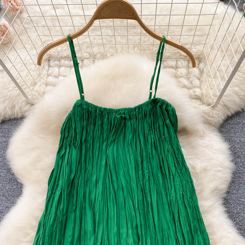 休日のスタイルのニッチなデザイン プリーツ グリーン サスペンダー スカート女性の 2022 夏の新しいヨーロッパとアメリカのゆったりとしたドレス サマー 夏物 ヨーロピアン lyxaj90722724644