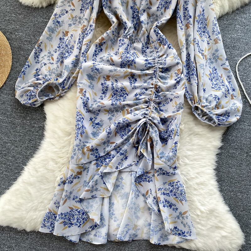French gentle wind lantern sleeve dress summer women's seaside vacation waist waist thin drawstring floral skirt tide ランタンスリーブ サマー 夏物 花柄 スカート lyxaj17918886027