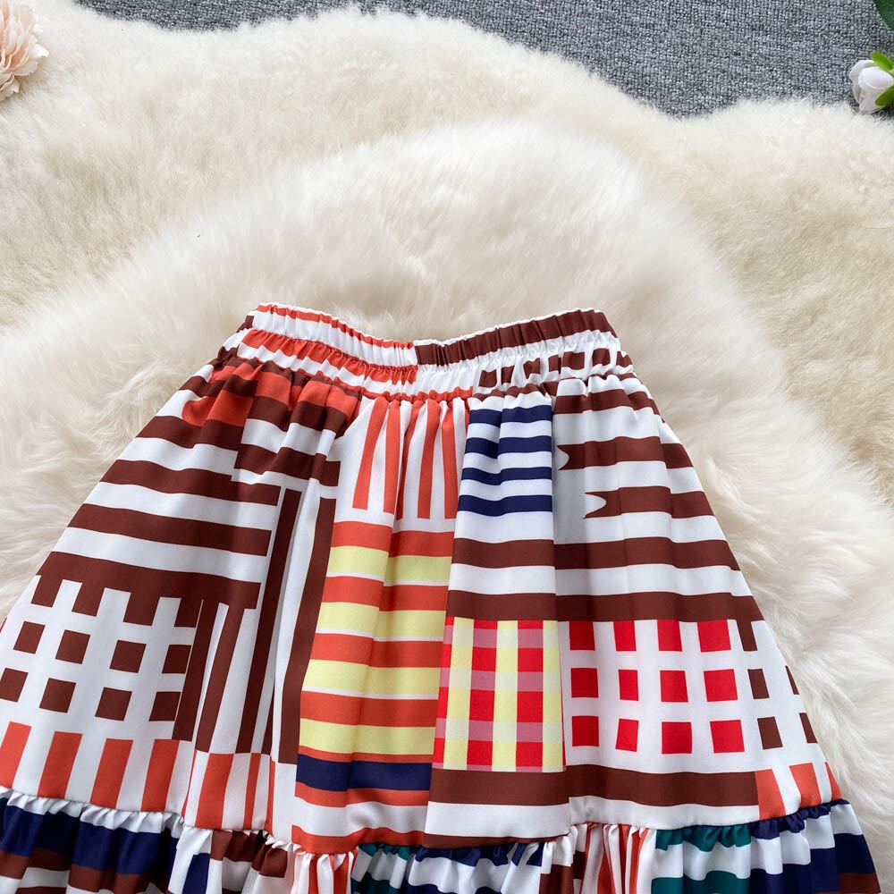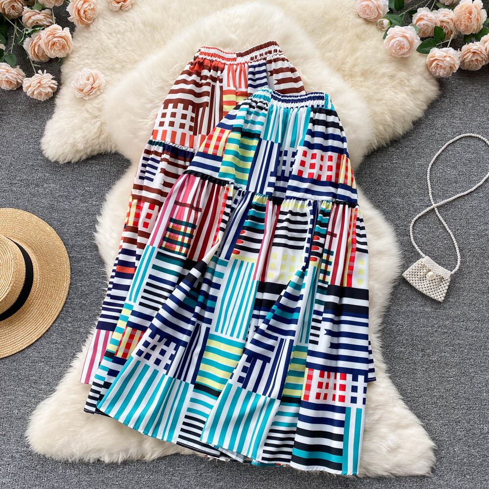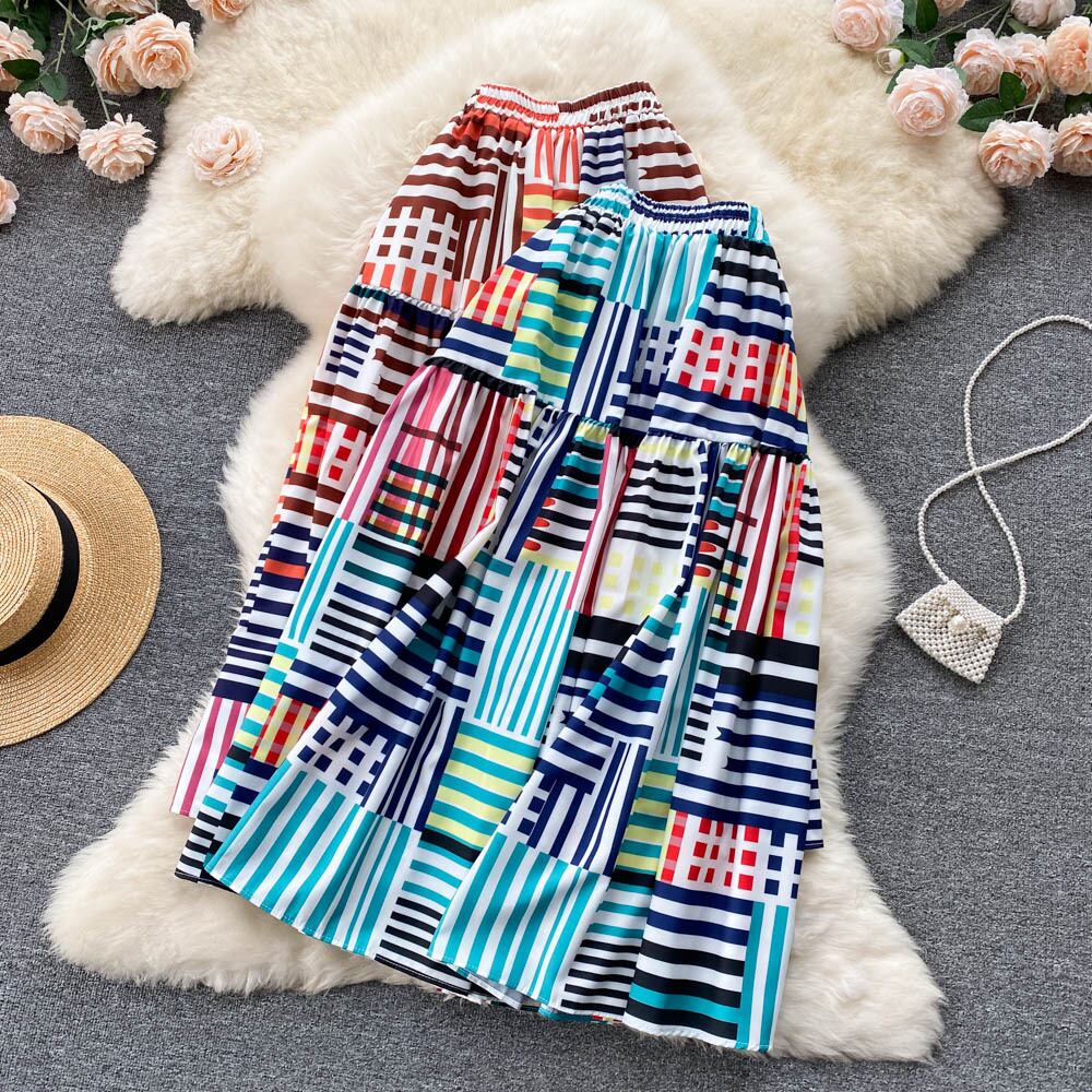 ins striped print skirt women's 2022 spring and summer new large swing mid-length loose all-match A-line skirt スプリング 春物 サマー 夏物 スカート Aライン ストライプ lyxaj73657169304