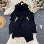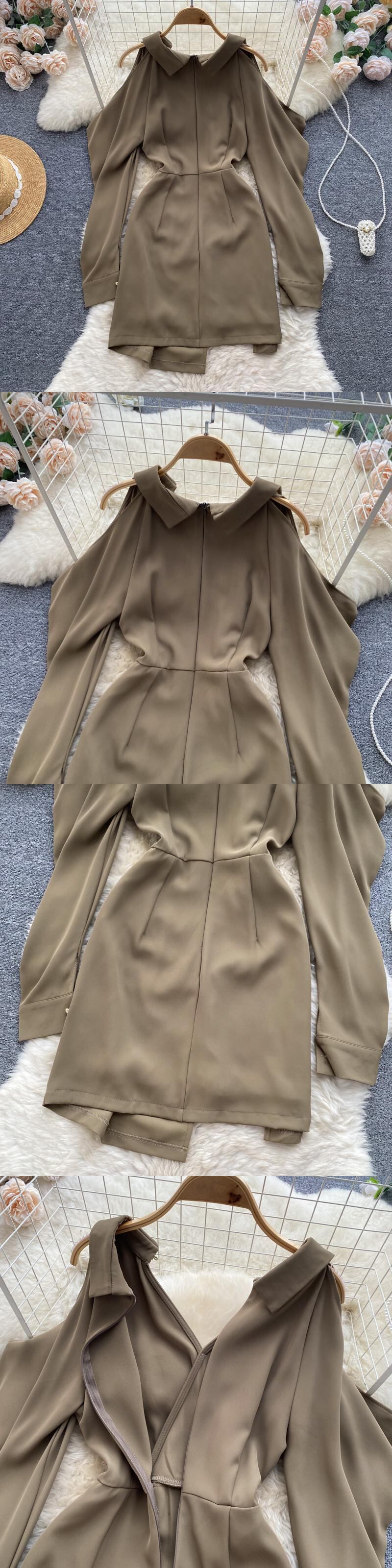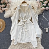 ハイエンドのニッチなデザインのウエストとストラップレスのVネックドレス秋の女性の気質の長袖シャツの短いスカートのトレンド ショート ロング オータム 秋物 lyxaj98778718844