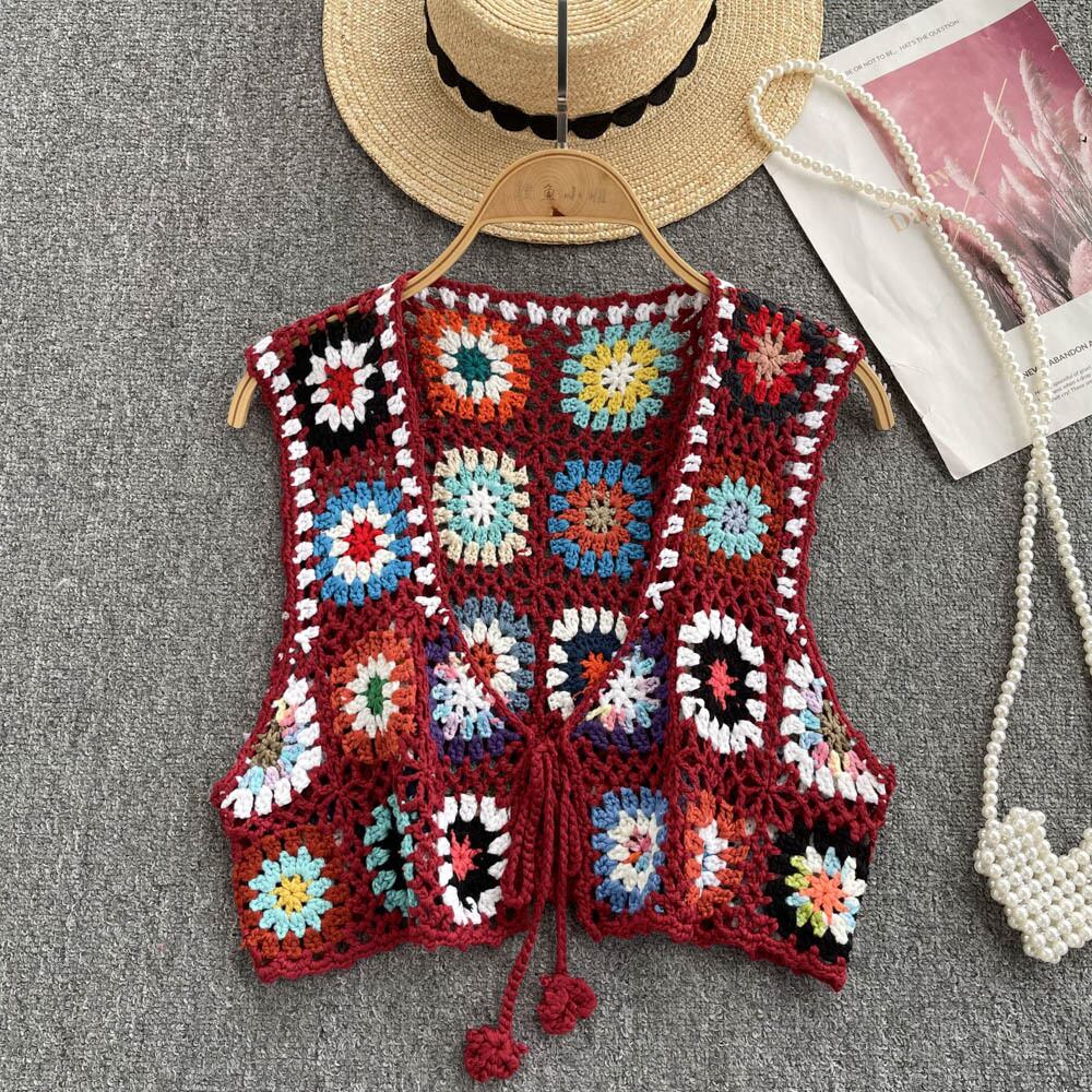 甘辛刺繍 中空ノースリーブ シックトップ ネット 赤 激辛ニット Vネック ショートベスト アウター デザインセンス 女性 レッド 大人ガーリー スウィート キュート カジュアル lyxaj1916229188