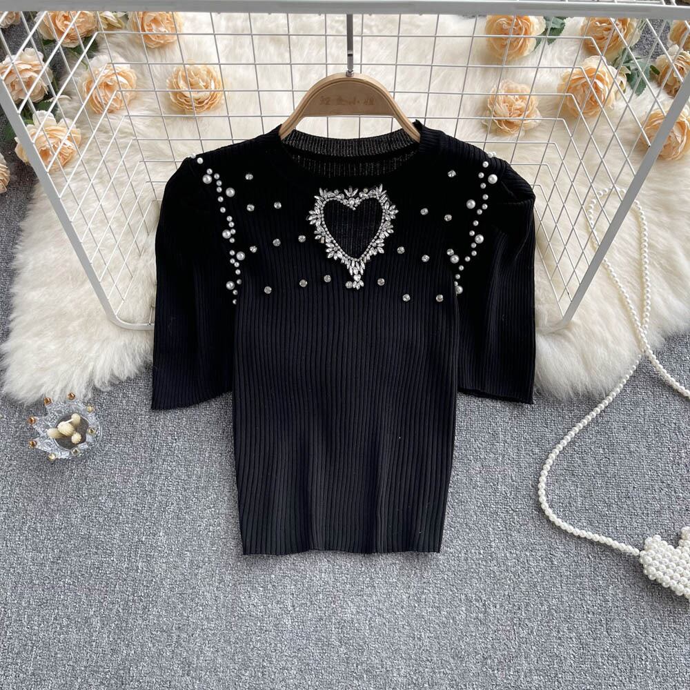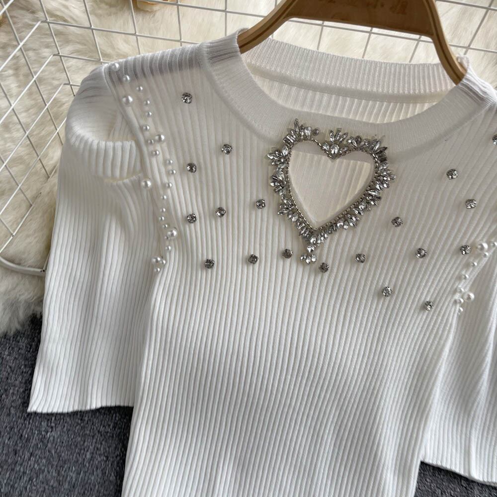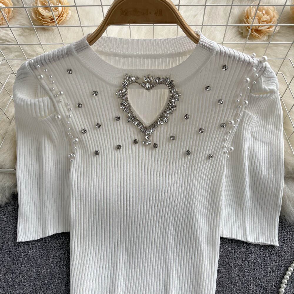 フランスのニッチ ダイヤモンドがちりばめられた愛の中空デザイン パフスリーブ ニット Tシャツ レディース ストレッチ 薄手 オールマッチ トップス lyxaj11829813532