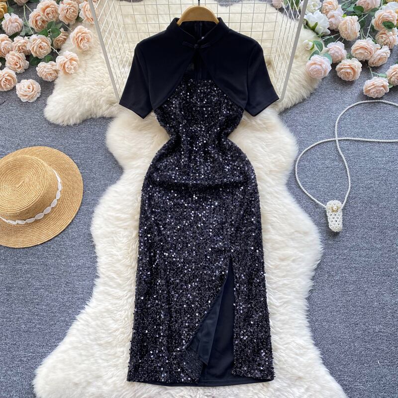 French retro light familiar style hollow sexy sequins high slit cheongsam dress female celebrity temperament package hip skirt レトロ スカート lyxaj81619172486
