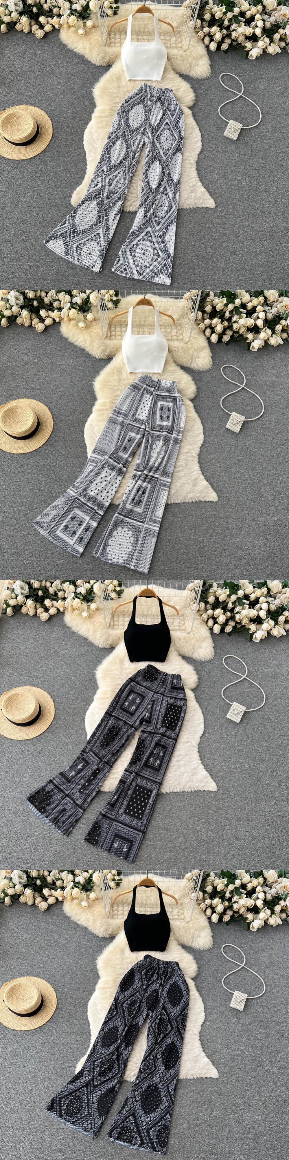 ホットガールレトロスーツ女性ホルターネックショートニットトップ+プリントアイスシルクカジュアルパンツワイドレッグパンツツーピースセット lyxaj43604104714