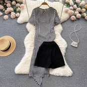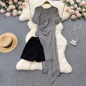 ファッショナブルなスーツ女性の夏のレトロな千鳥格子プリーツ ウエストの韓国語バージョン不規則な分割ロング スカート ショート パンツ 2 点セット サマー 夏物 ショーツ ブルマー lyxaj25633679556