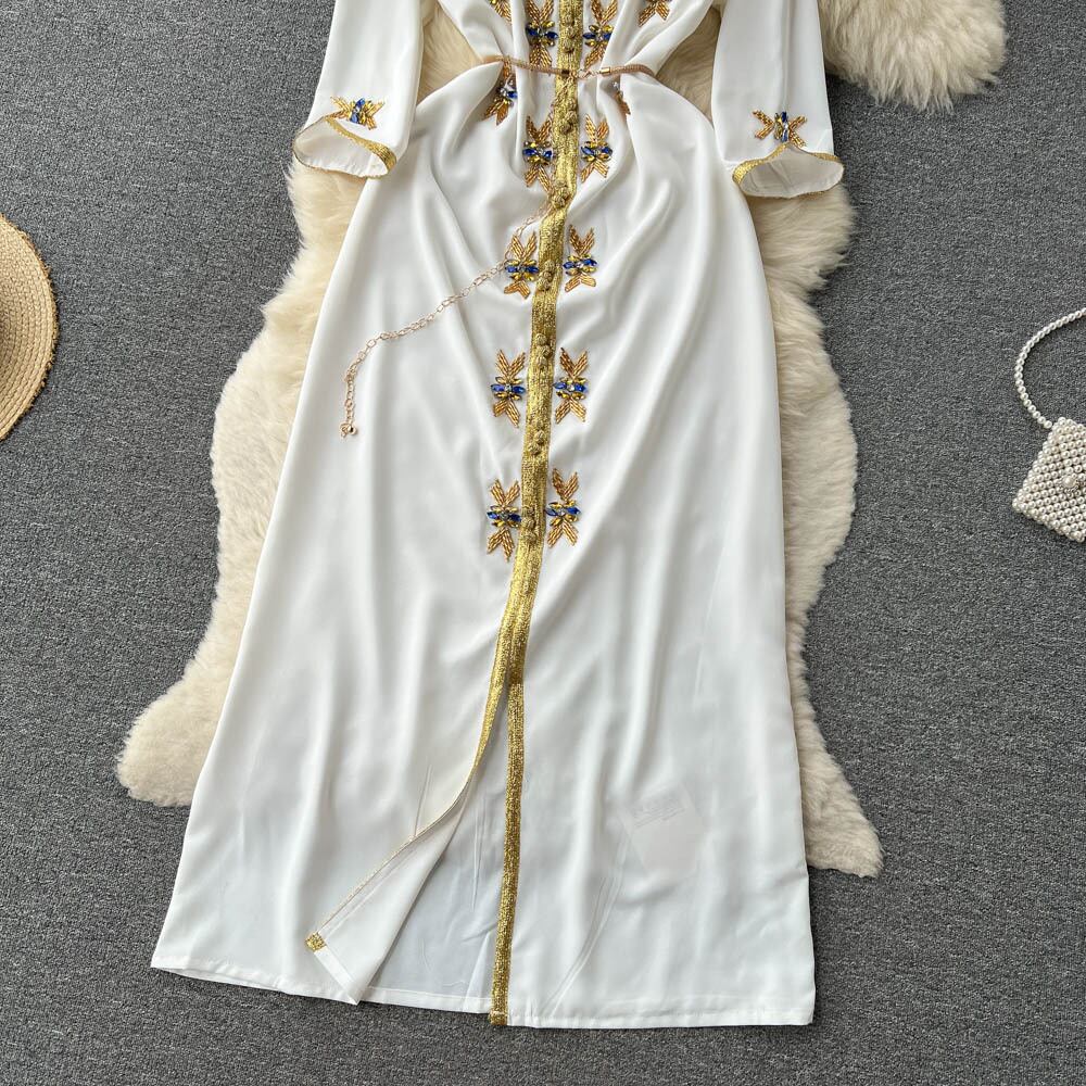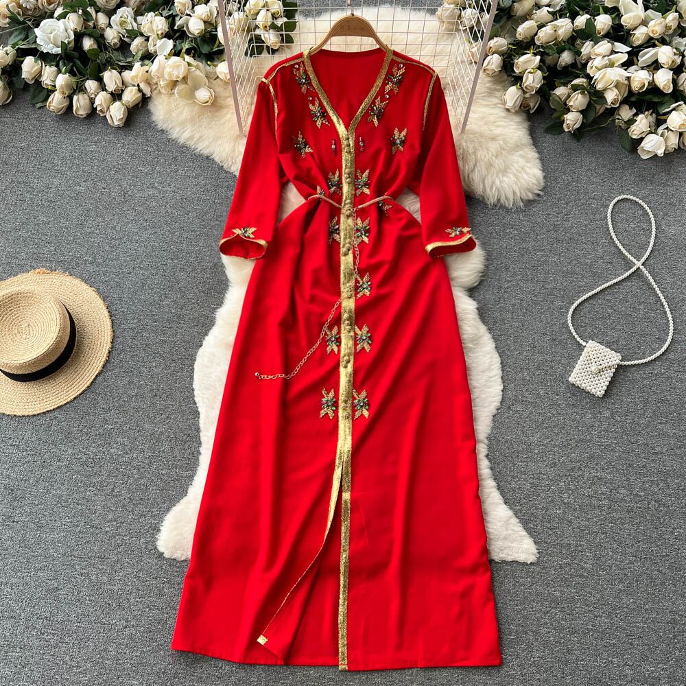 エスニック スタイル ニッチ デザイン刺繍 V ネック スカート 2022 新しいハイエンド センス ウエスト スリム気質ドレス女性 レッド Vネック lyxaj80840199783