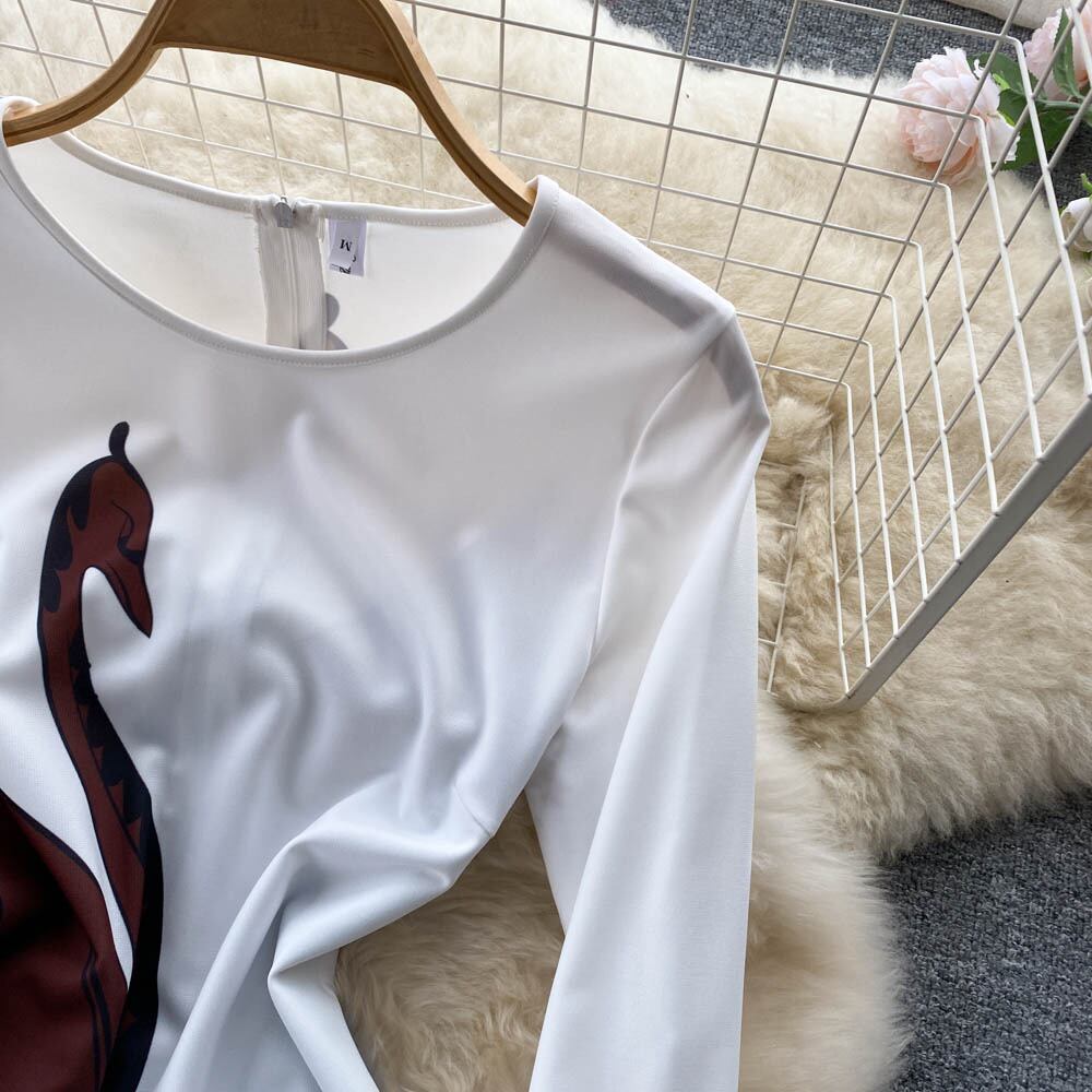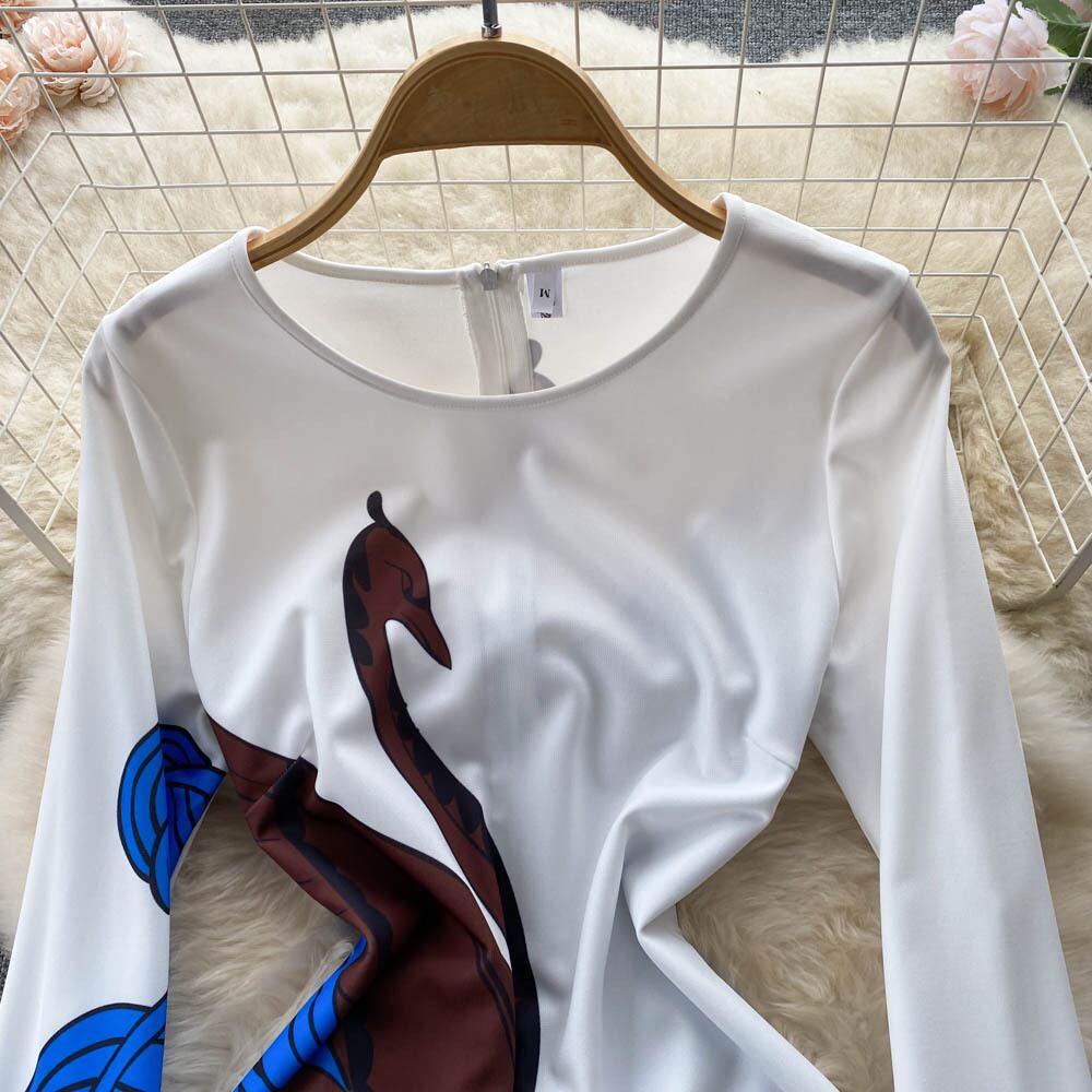 春服の新しい気質 Yujie Fan ラウンド ネック長袖青と白のプリント スリム フィットとスリムな大きなスイング ロング スカート ドレス ドレス ホワイト ブルー スプリング 春物 Oネック lyxaj25918003955