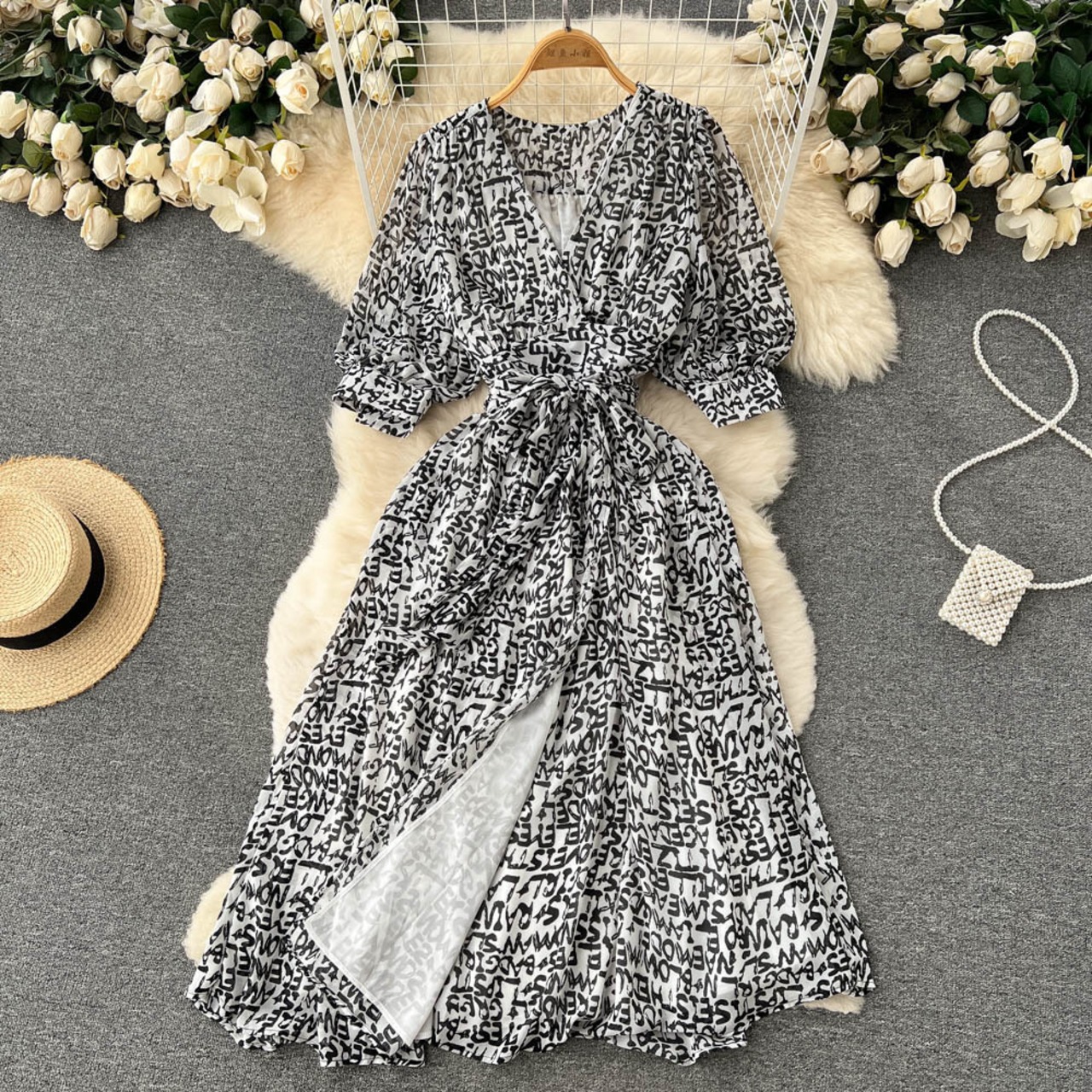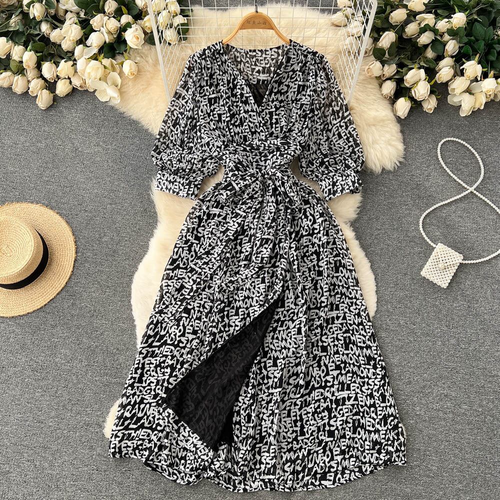 有名人気質 v ネックティーブレイクドレス 2022 夏新ハイウエストレースアップスリムパフスリーブ大スイングドレス女性 サマー 夏物 Vネック lyxaj73666606700