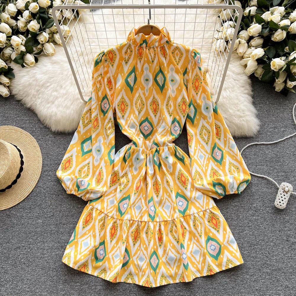 春の新しいボヘミアン ドレス女性のフレンチ ランタン スリーブ菌エッジ シングルブレスト ミッドレングス プリント ドレス ランタンスリーブ スプリング 春物 lyxaj62502928655