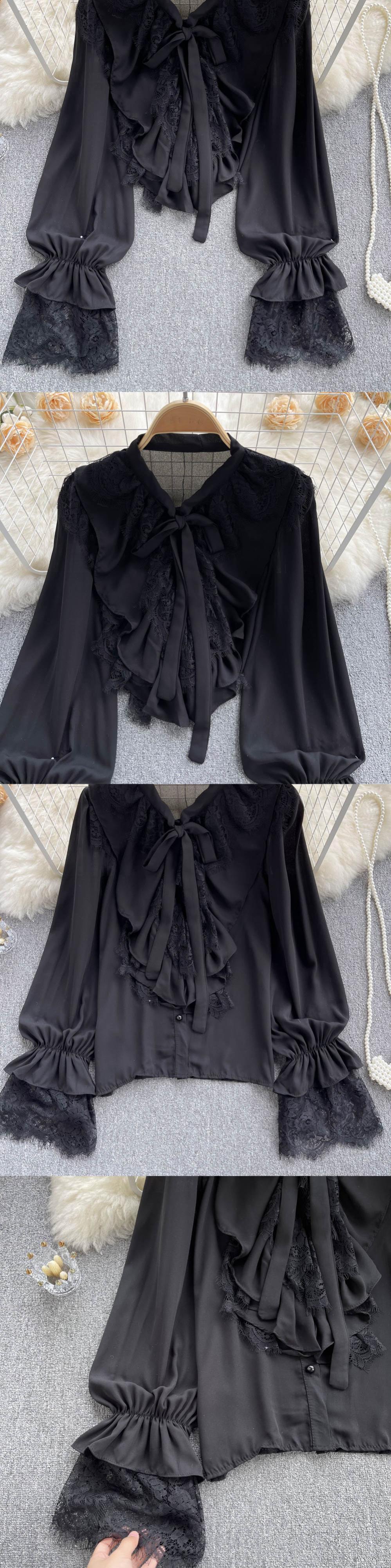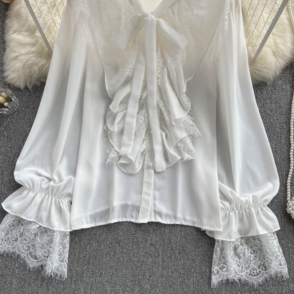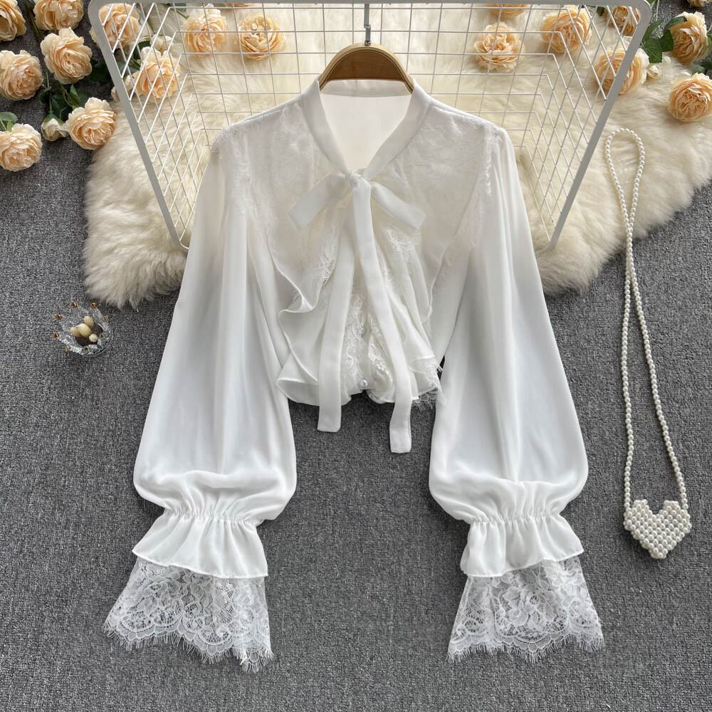 French gentle wind ruffled age-reducing super fairy temperament shirt stitching lace chiffon long-sleeved all-match loose top ロング シフォン レース ステッチ lyxaj27558784172