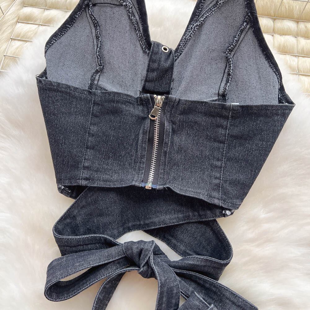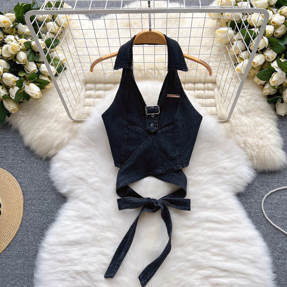 Yujie 軽く調理された吊りネック V ネック スリム ショート レースアップ トップ香港スタイル デニム気質ツーピース スーツ ハイウエスト スカート Vネック lyxaj40037299809
