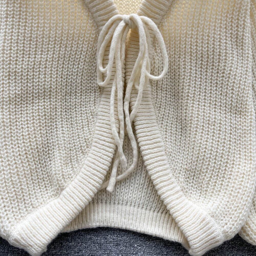 年齢を減らすフレンチ パフ スリーブ レースアップ ニット セーター トップ女性の秋の怠惰なスタイル緩い V ネック セーター カーディガン コート オータム 秋物 Vネック lyxaj75007071782