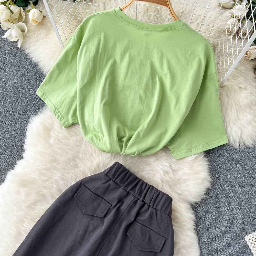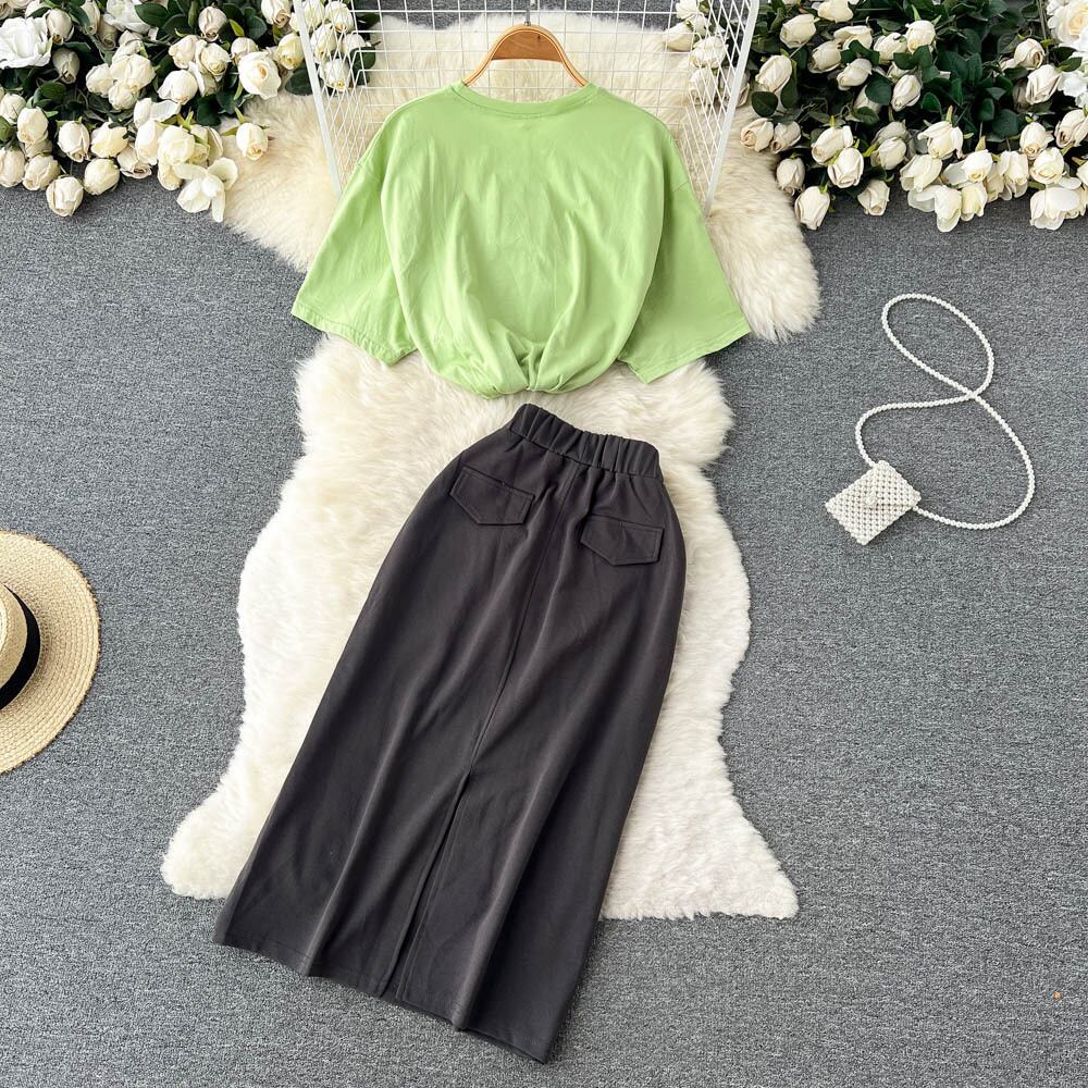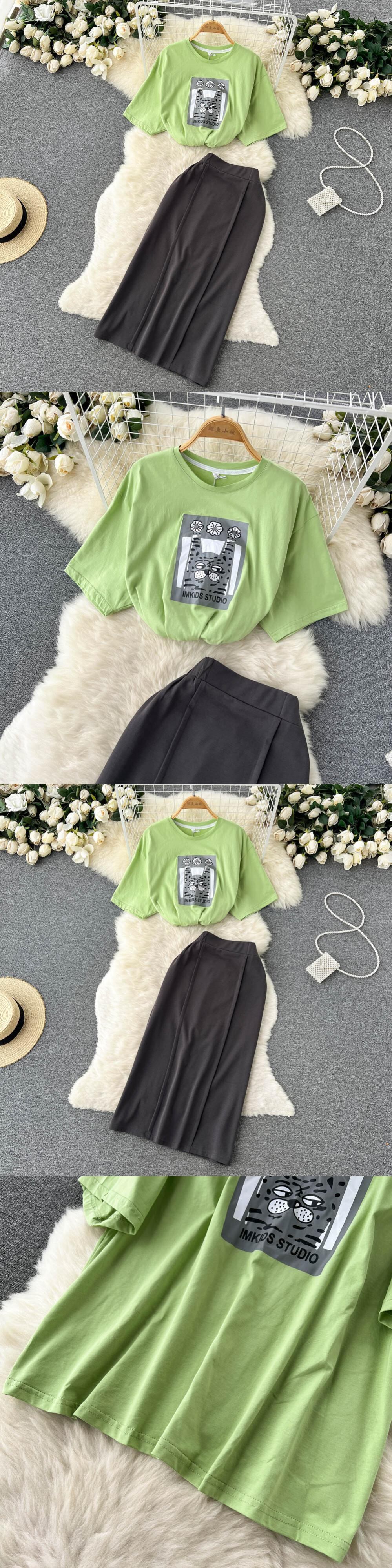 2022年夏 スーツ 年齢を抑えたデザインセンス プリント半袖Tシャツ レディース オールマッチ ミドル丈 スカート ツーピース トレンド サマー 夏物 lyxaj52569439819
