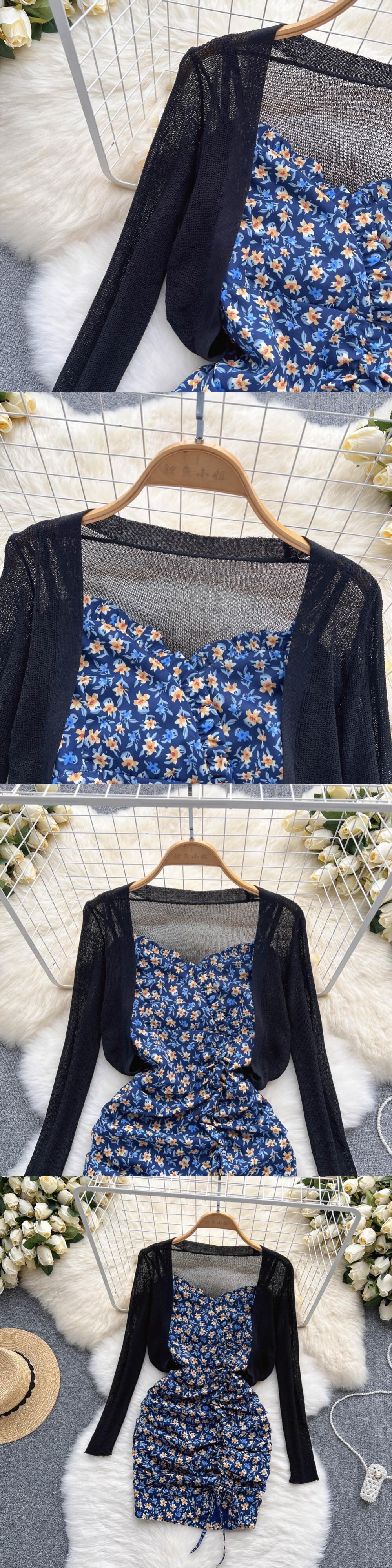 セレブ気質デザインセンス長袖メッシュショールコートプリーツ巾着チューブトップサスペンダードレスツーピーススーツ ロング lyxaj37847251847