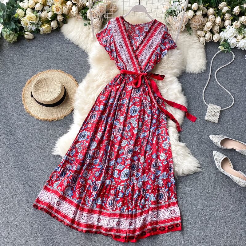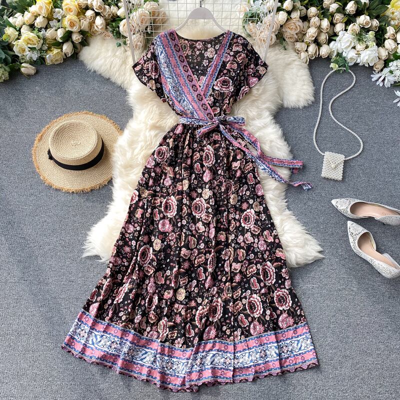 ボヘミアンリゾート風ロングドレスレトロプリントVネック半袖ウエストタイオープンサンドディストレスドレス ショート ハーフスリーブ lyxaj35306610193