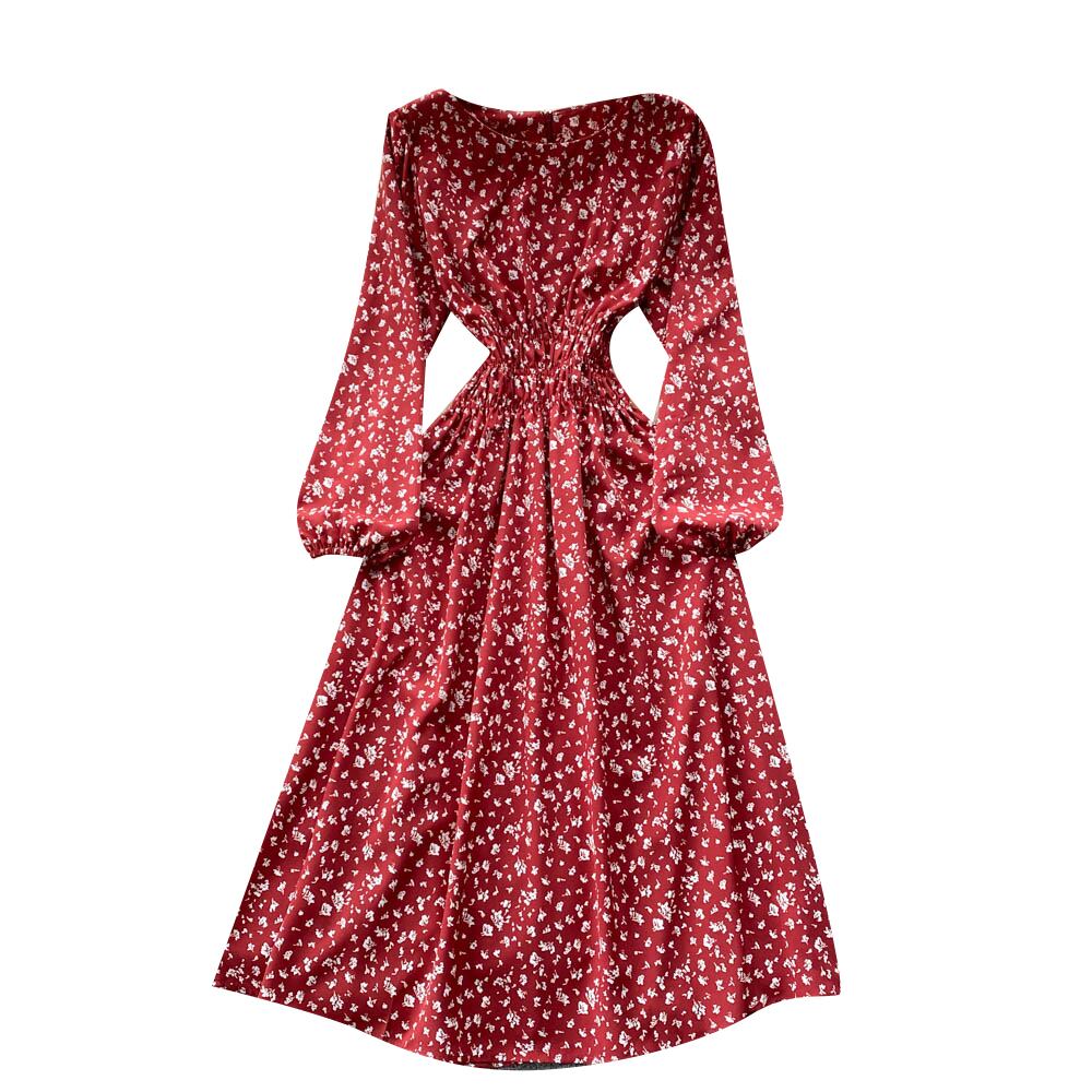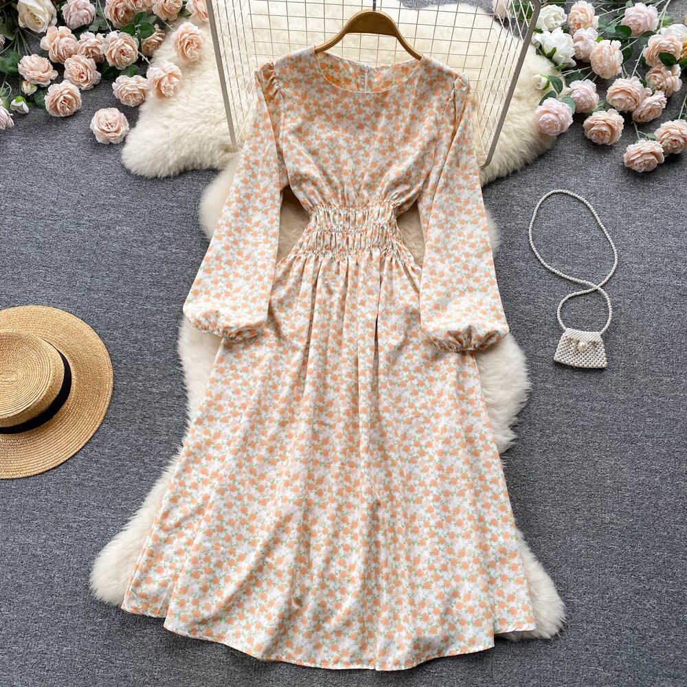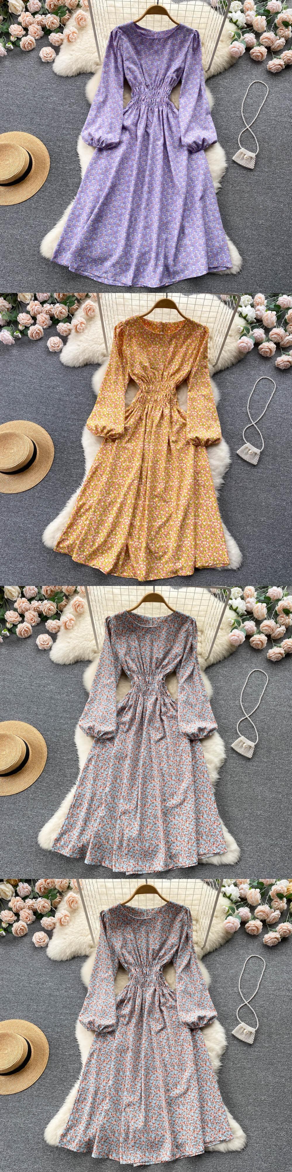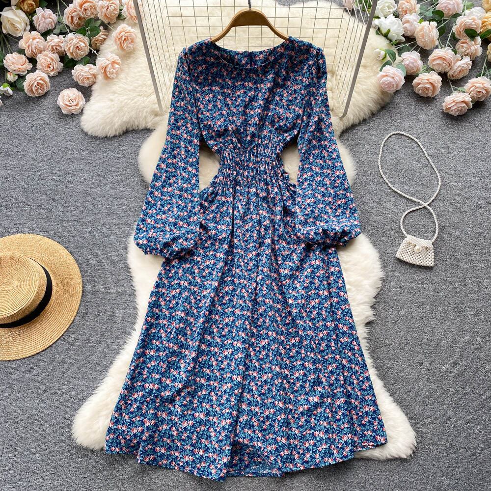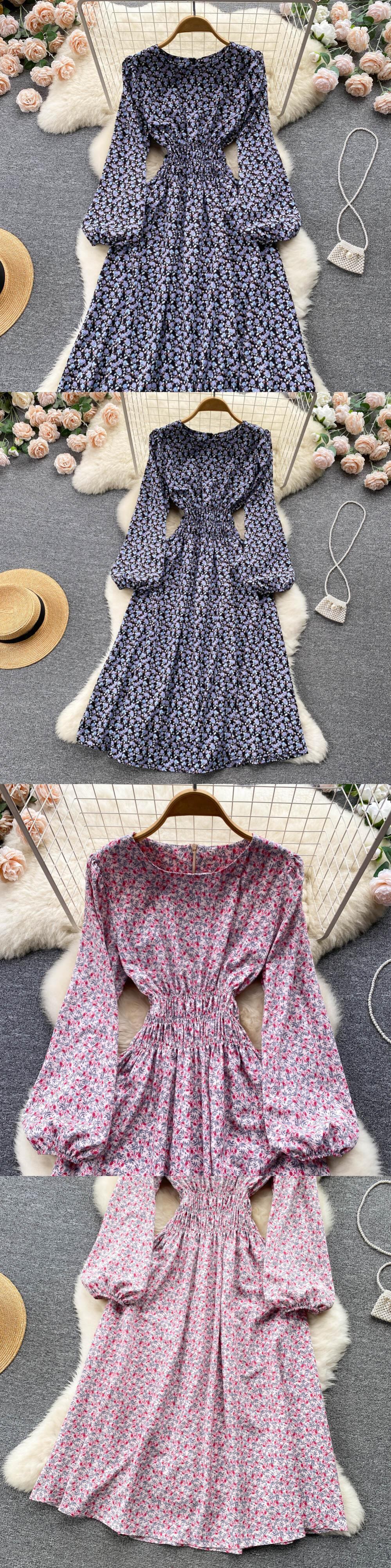 Round neck floral chiffon dress women's new retro puff sleeves waist slim pleated temperament large swing long skirt ロング シフォン レトロ プリーツ 花柄 スカート Oネック スリム lyxaj56637710428
