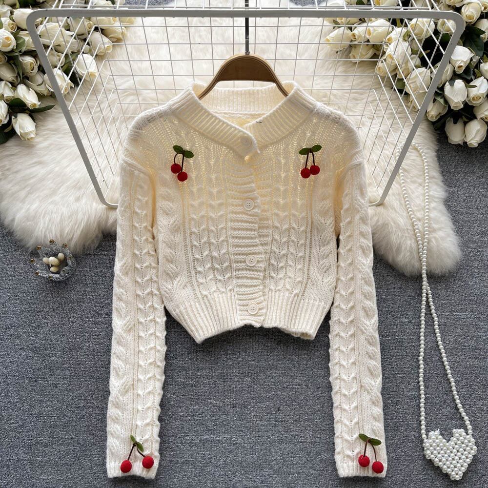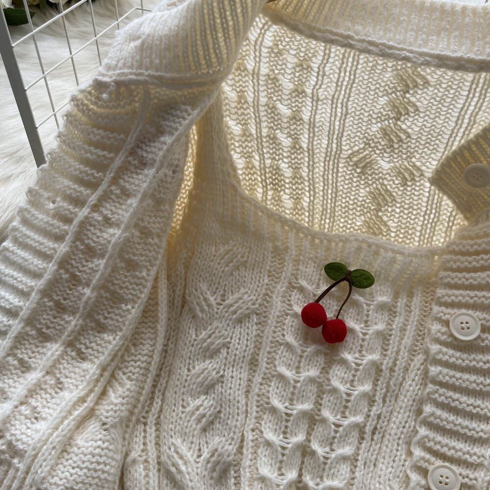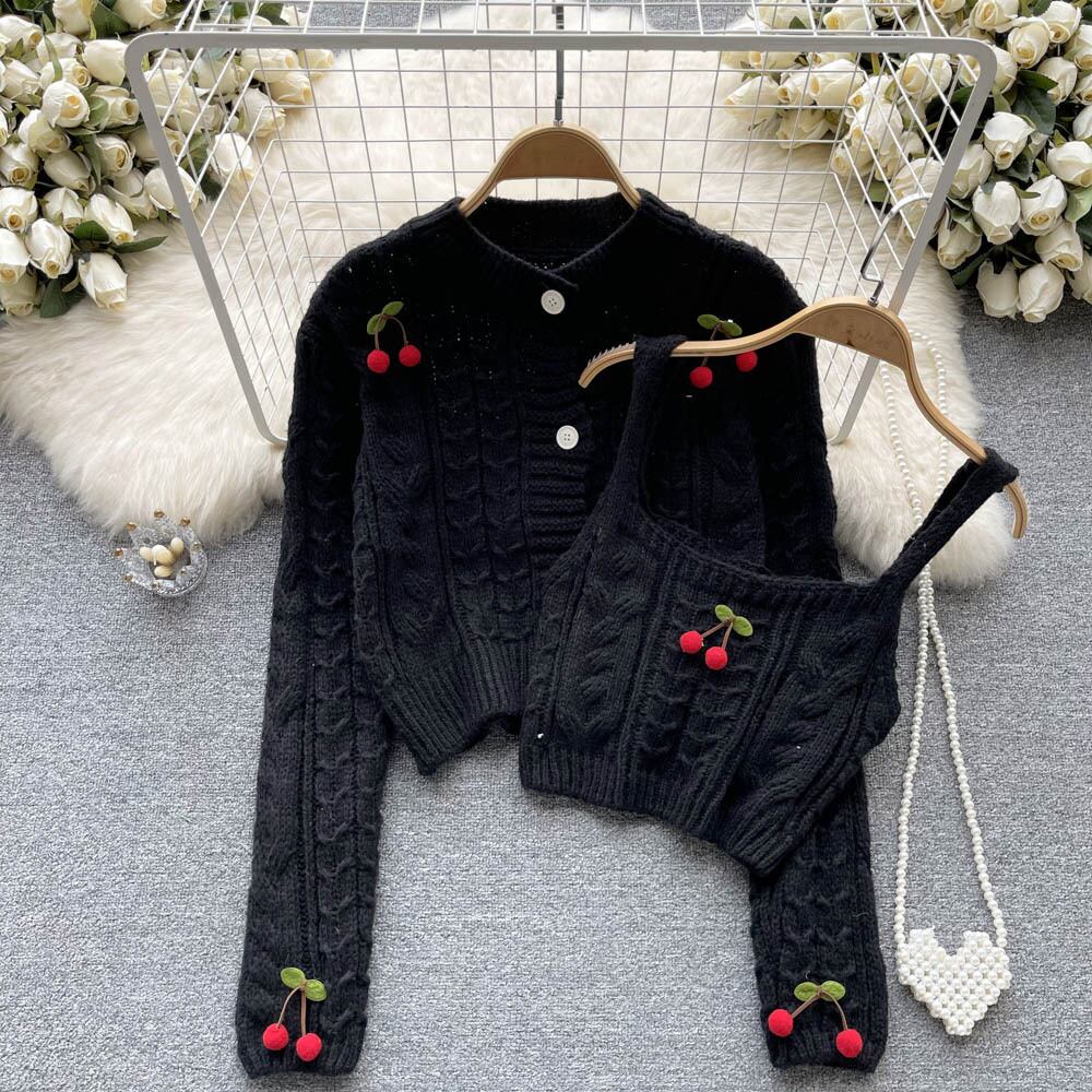 ese college style two-piece suit female autumn cherry long-sleeved knitted sweater cardigan coat short camisole ショート ロング カーディガン オータム 秋物 lyxaj87030907108
