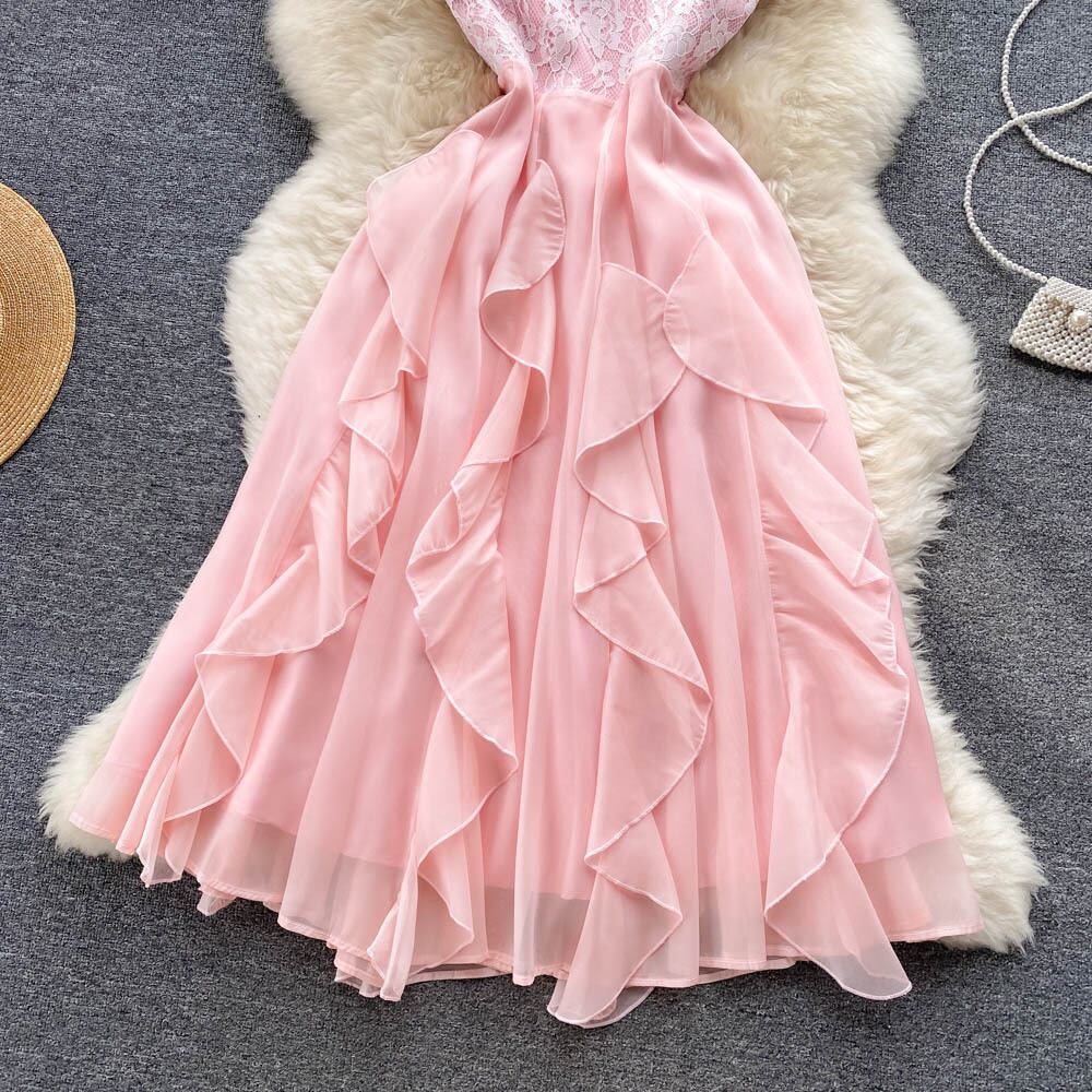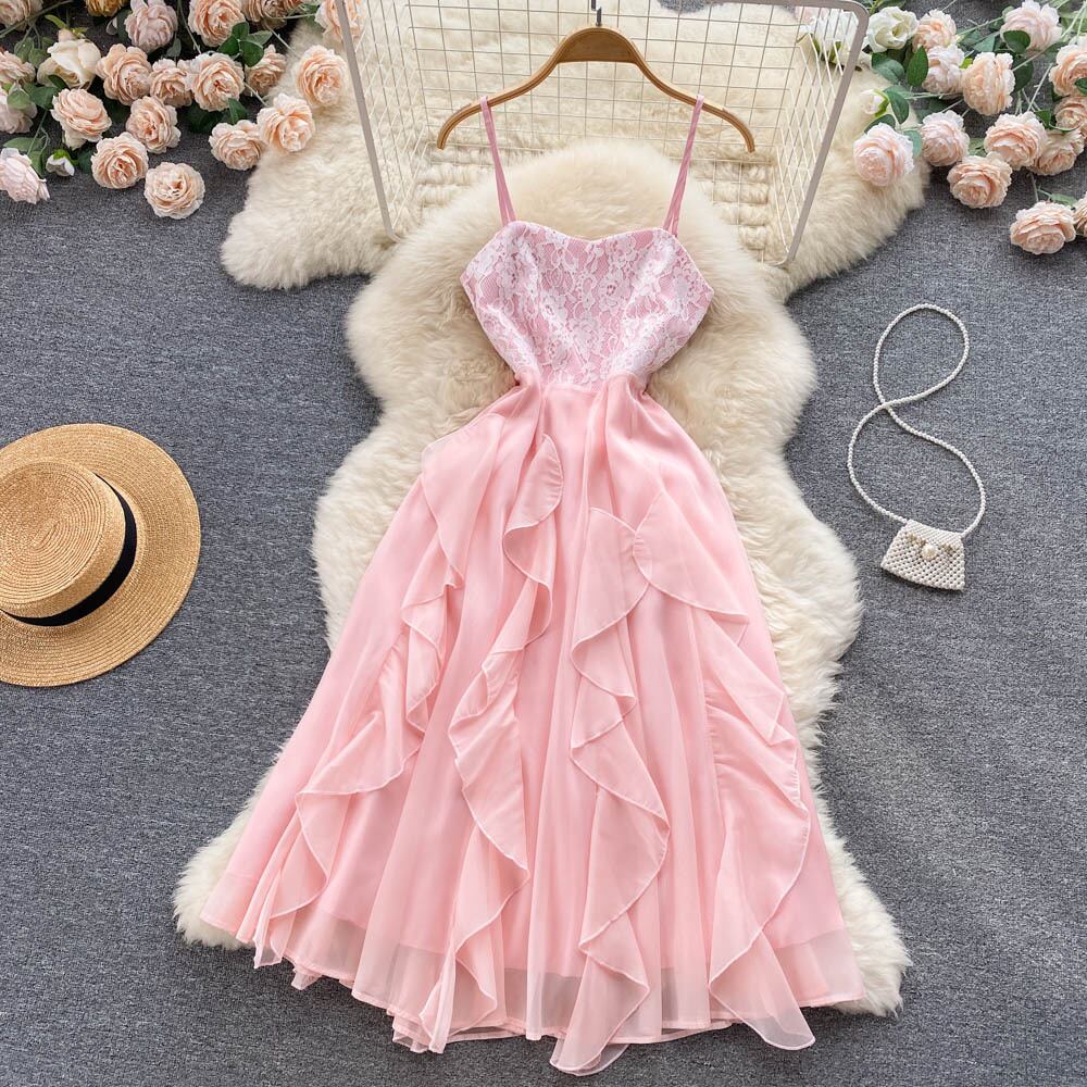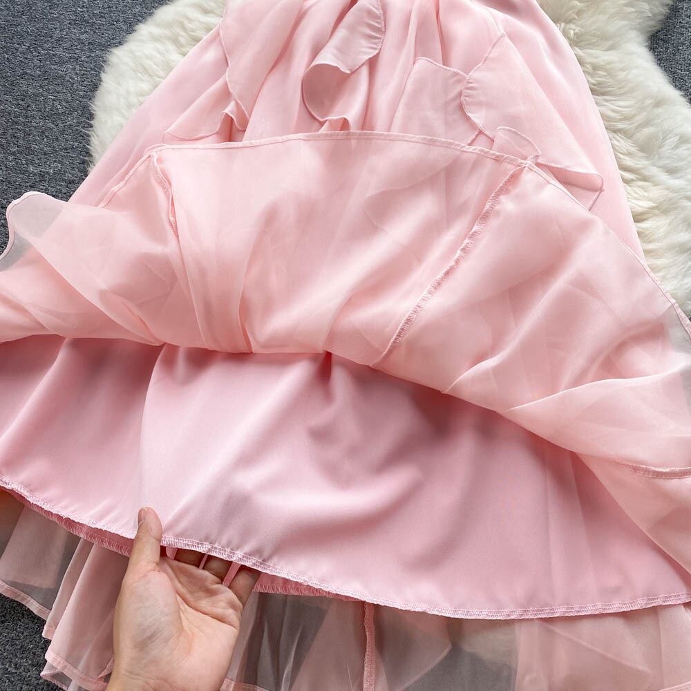 フランスのニッチドレスステッチ不規則なフリルミディスカート2022年夏新作ネットレッドサスペンダースカート サマー 夏物 lyxaj55494124470