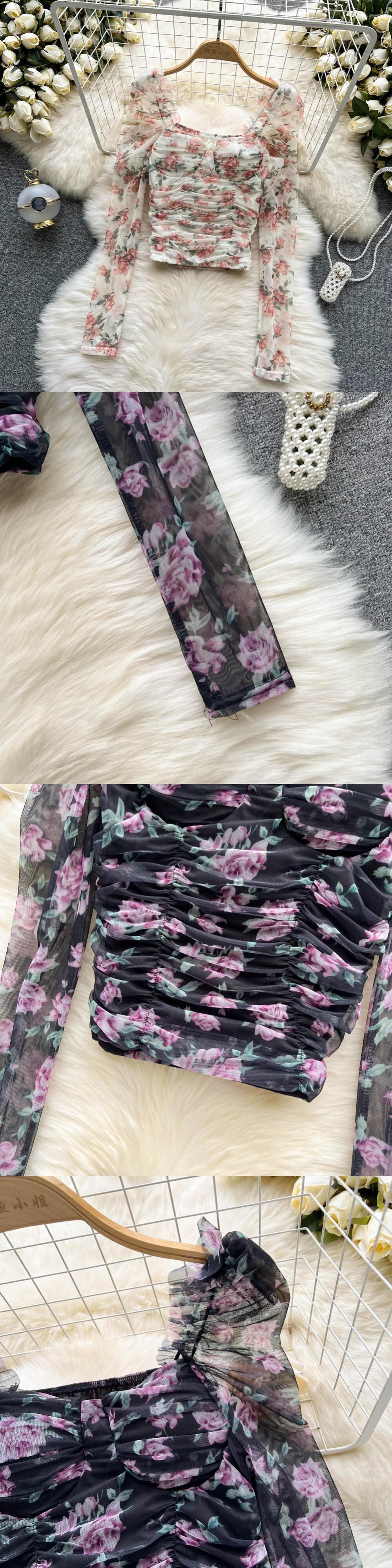 version chic small short section thin section long-sleeved shirt women's fashion print pleated slim fit all-match sweet and spicy top ショート ロング 大人ガーリー スウィート キュート カジュアル プリーツ スリム lyxaj67053566164