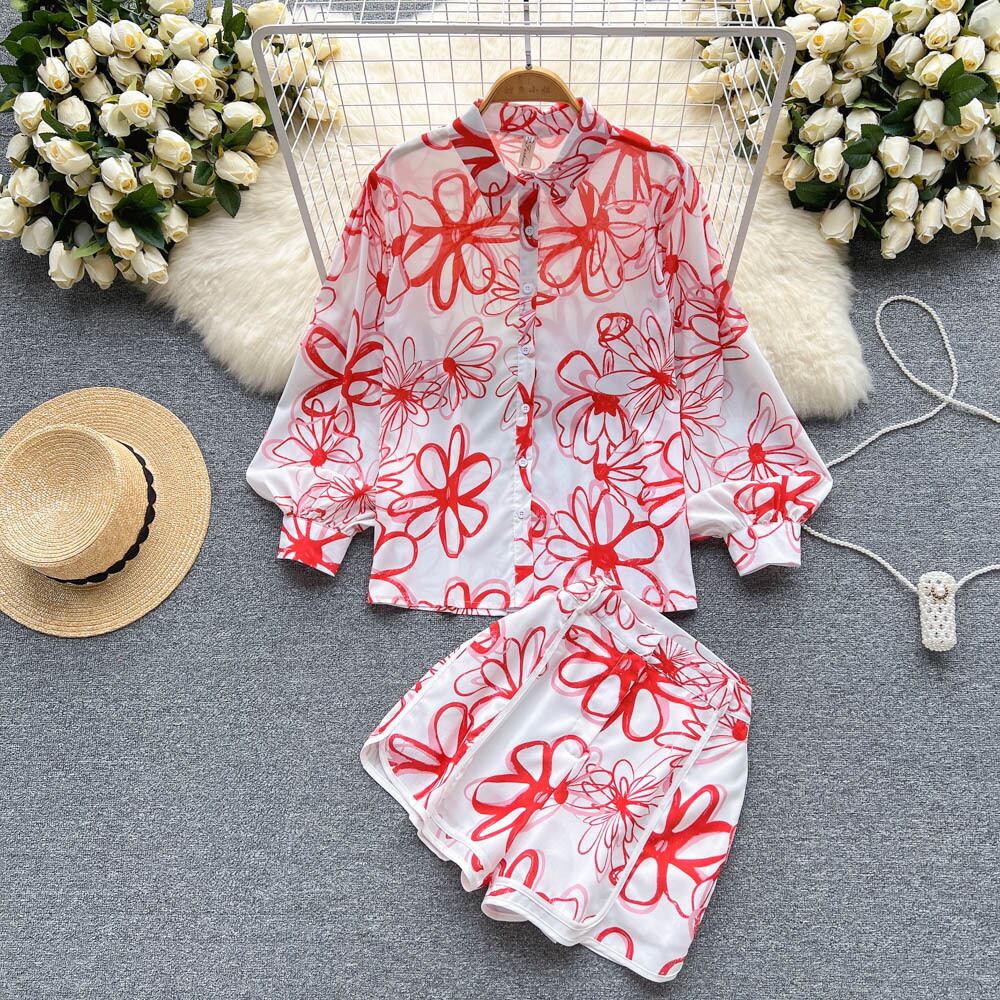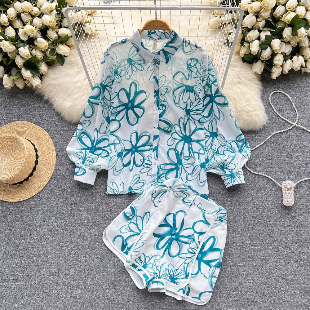 Light familiar style print suit retro lantern sleeve lapel shirt women's high waist wide leg shorts fashion all-match two-piece suit ハイウェスト ランタンスリーブ レトロ ショーツ ブルマー ワイドレッグ ワイドパンツ lyxaj5695416106